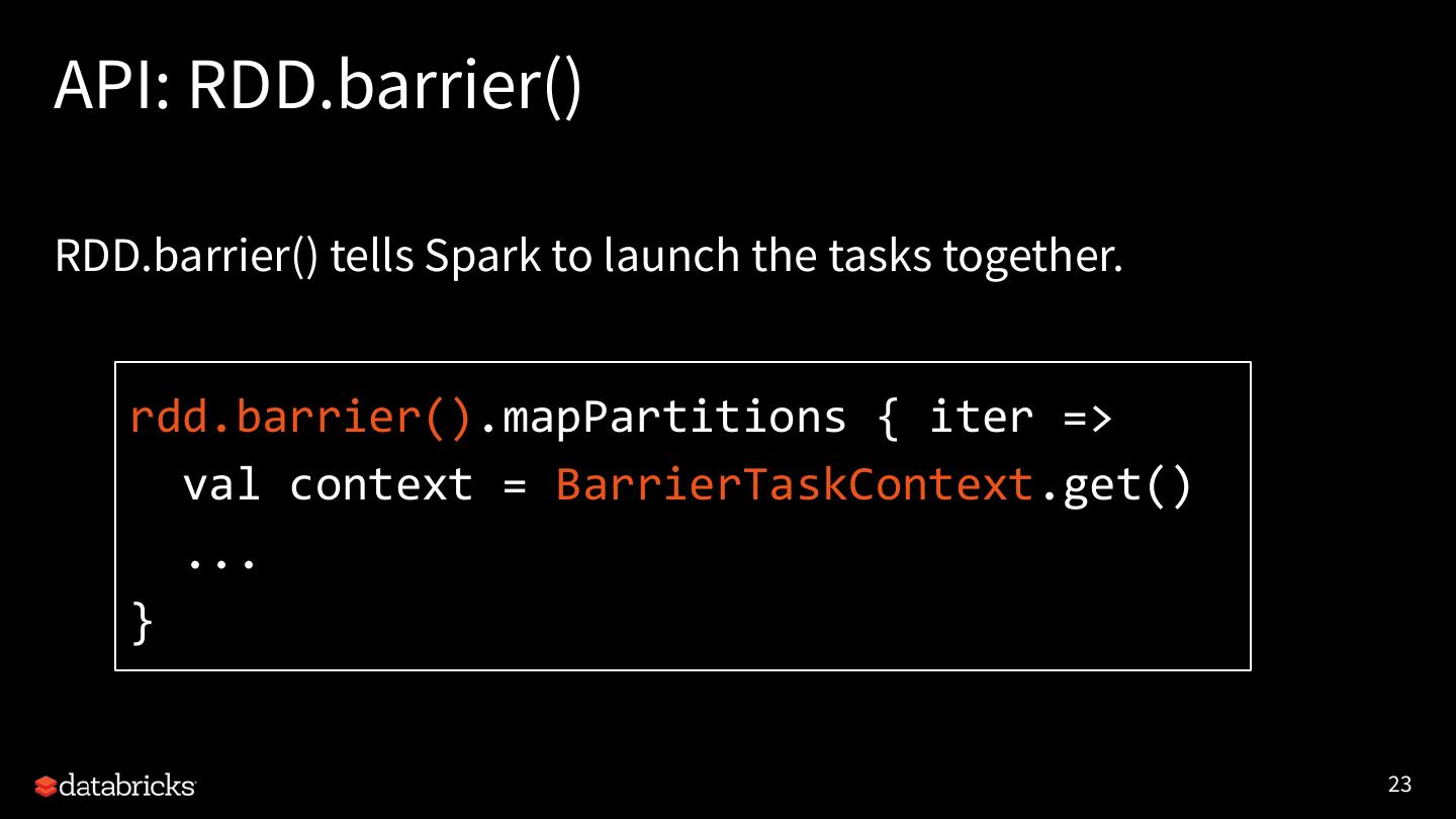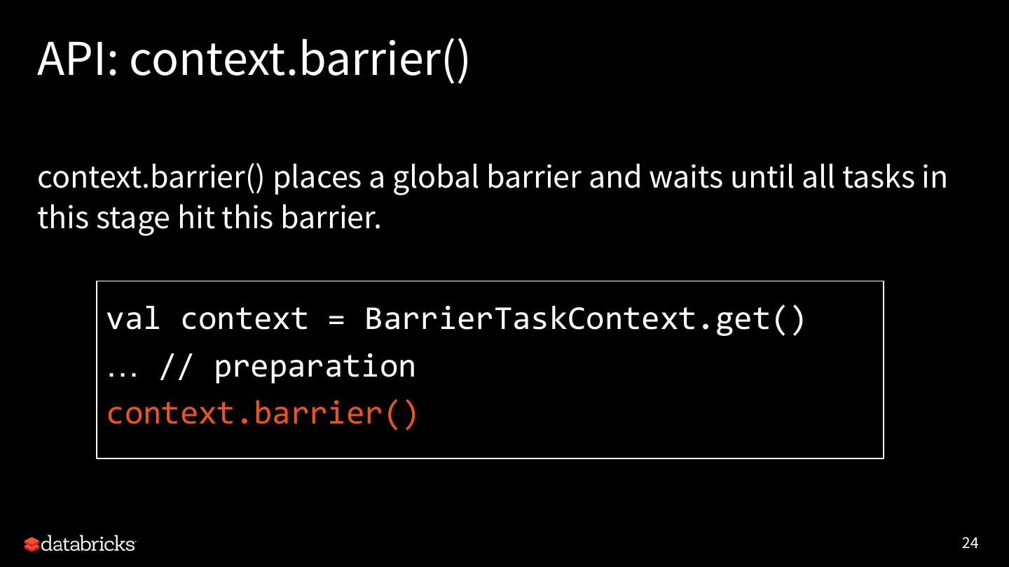 23 .API: RDD.barrier() RDD.barrier() tells Spark to launch the tasks together. rdd.barrier().mapPartitions { iter => val context = BarrierTaskContext.get() ... } 23