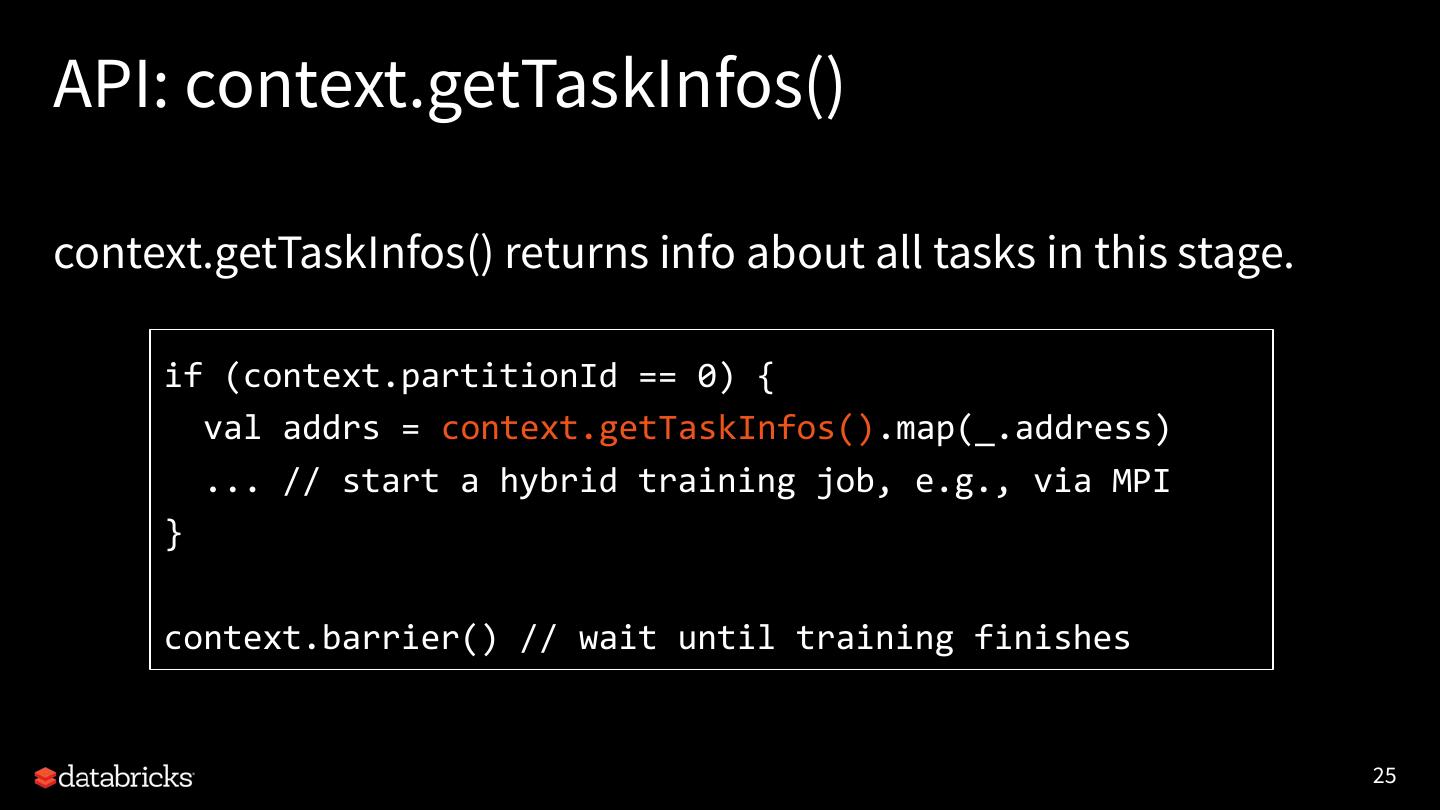 24 .API: context.barrier() context.barrier() places a global barrier and waits until all tasks in this stage hit this barrier. val context = BarrierTaskContext.get() … // preparation context.barrier() 24