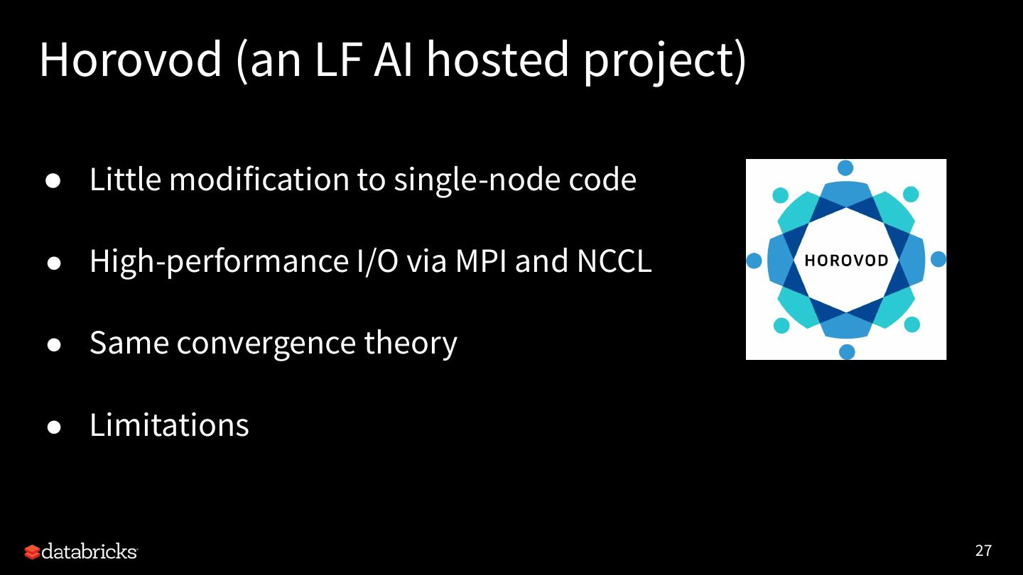 27 .Horovod (an LF AI hosted project) ● Little modification to single-node code ● High-performance I/O via MPI and NCCL ● Same convergence theory ● Limitations 27
