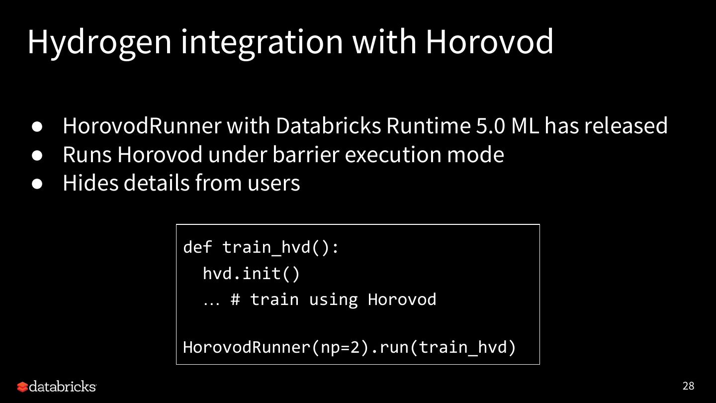 28 .Hydrogen integration with Horovod ● HorovodRunner with Databricks Runtime 5.0 ML has released ● Runs Horovod under barrier execution mode ● Hides details from users def train_hvd(): hvd.init() … # train using Horovod HorovodRunner(np=2).run(train_hvd) 28