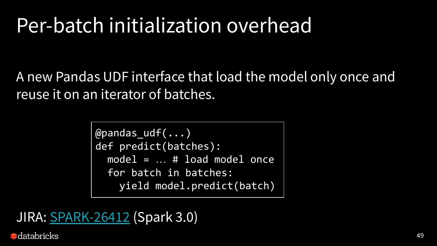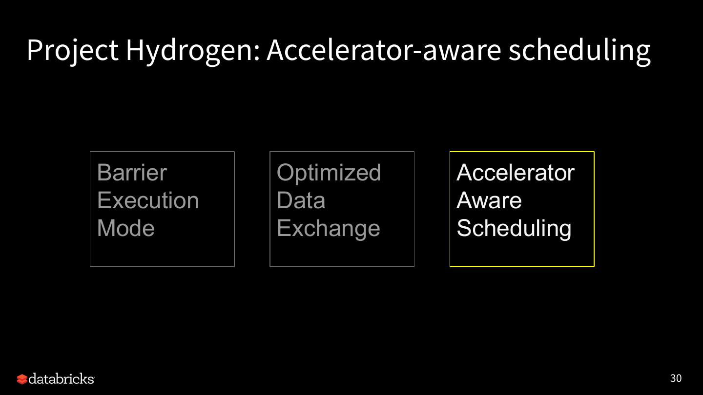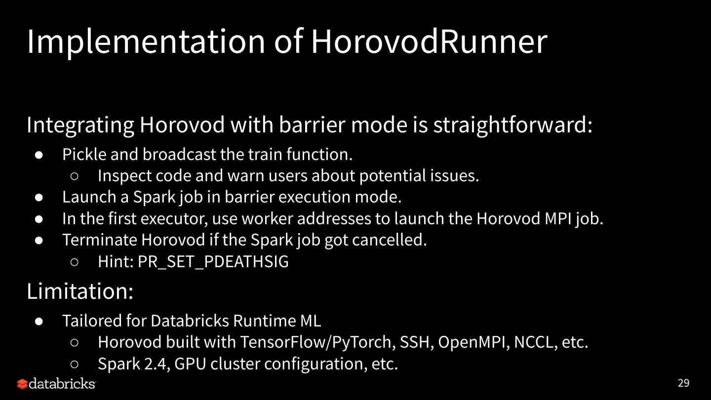 29 .Implementation of HorovodRunner Integrating Horovod with barrier mode is straightforward: ● Pickle and broadcast the train function. ○ Inspect code and warn users about potential issues. ● Launch a Spark job in barrier execution mode. ● In the first executor, use worker addresses to launch the Horovod MPI job. ● Terminate Horovod if the Spark job got cancelled. ○ Hint: PR_SET_PDEATHSIG Limitation: ● Tailored for Databricks Runtime ML ○ Horovod built with TensorFlow/PyTorch, SSH, OpenMPI, NCCL, etc. ○ Spark 2.4, GPU cluster configuration, etc. 29