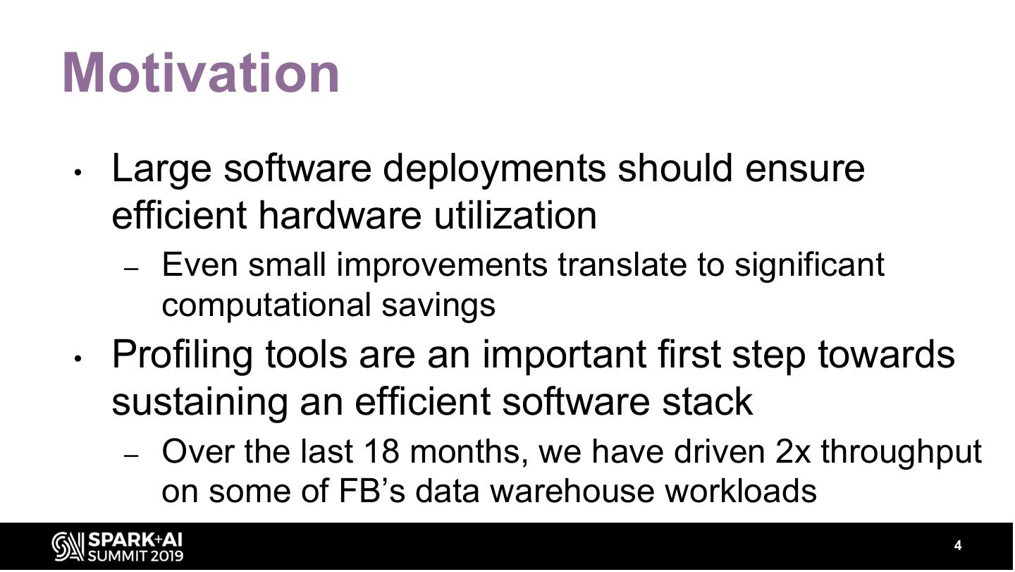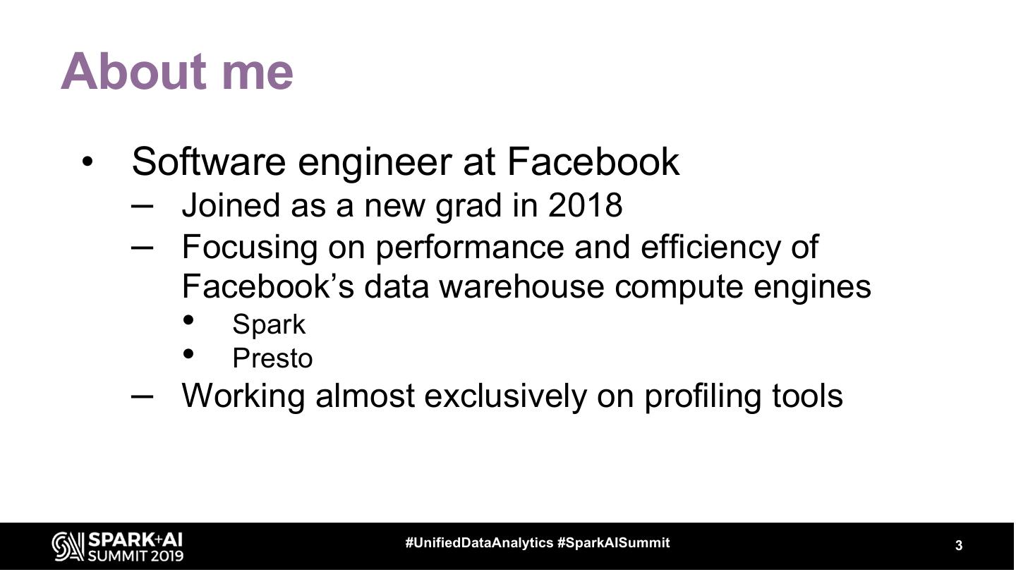 3 .About me • Software engineer at Facebook – Joined as a new grad in 2018 – Focusing on performance and efficiency of Facebook’s data warehouse compute engines • Spark • Presto – Working almost exclusively on profiling tools #UnifiedDataAnalytics #SparkAISummit 3