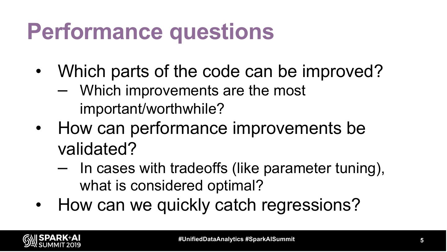 5 .Performance questions • Which parts of the code can be improved? – Which improvements are the most important/worthwhile? • How can performance improvements be validated? – In cases with tradeoffs (like parameter tuning), what is considered optimal? • How can we quickly catch regressions? #UnifiedDataAnalytics #SparkAISummit 5