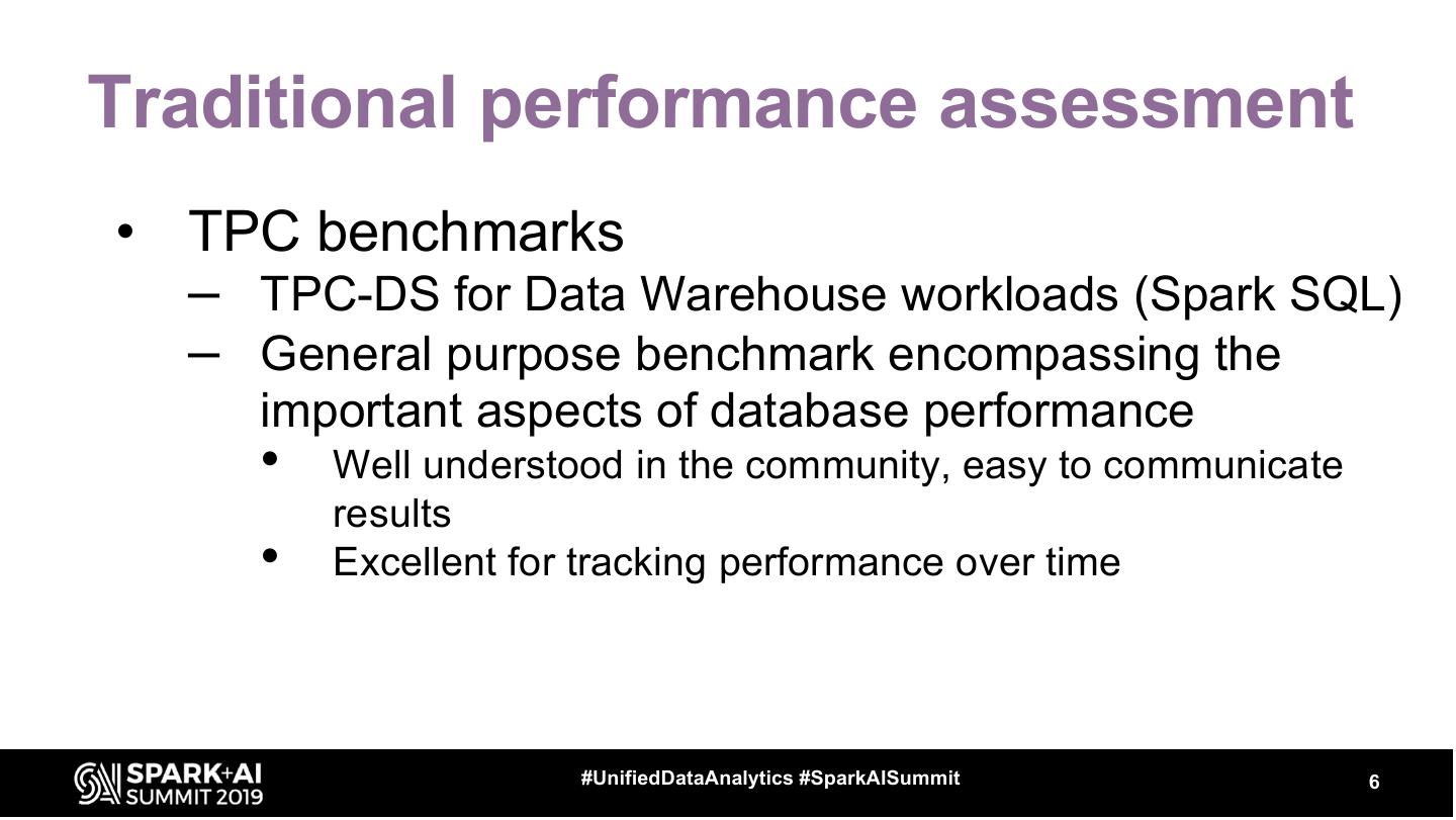 6 .Traditional performance assessment • TPC benchmarks – TPC-DS for Data Warehouse workloads (Spark SQL) – General purpose benchmark encompassing the important aspects of database performance • Well understood in the community, easy to communicate results • Excellent for tracking performance over time #UnifiedDataAnalytics #SparkAISummit 6