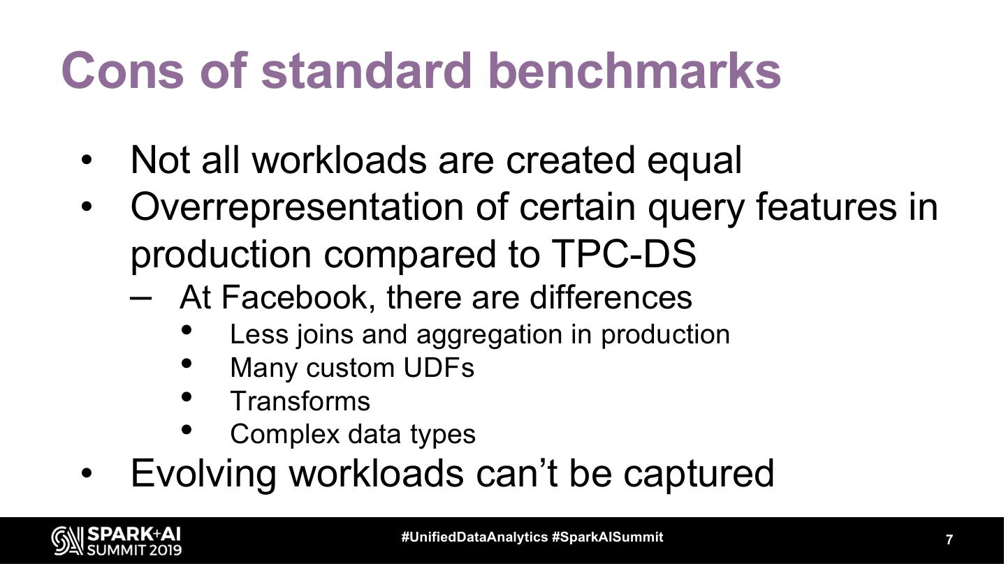 7 .Cons of standard benchmarks • Not all workloads are created equal • Overrepresentation of certain query features in production compared to TPC-DS – At Facebook, there are differences • Less joins and aggregation in production • Many custom UDFs • Transforms • Complex data types • Evolving workloads can’t be captured #UnifiedDataAnalytics #SparkAISummit 7