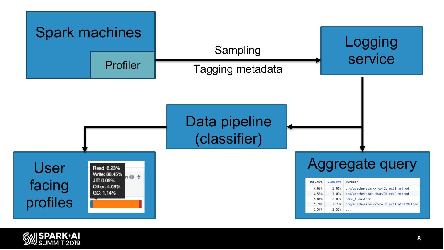 8 . Spark machines Sampling Logging Profiler service Tagging metadata Data pipeline (classifier) User Aggregate query facing profiles 8