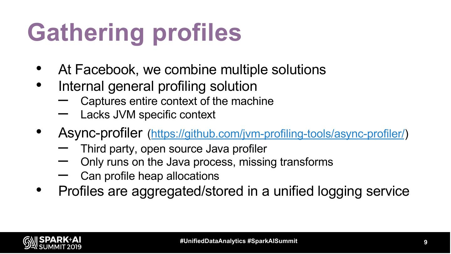 9 .Gathering profiles • At Facebook, we combine multiple solutions • Internal general profiling solution – Captures entire context of the machine – Lacks JVM specific context • Async-profiler (https://github.com/jvm-profiling-tools/async-profiler/) – Third party, open source Java profiler – Only runs on the Java process, missing transforms – Can profile heap allocations • Profiles are aggregated/stored in a unified logging service #UnifiedDataAnalytics #SparkAISummit 9