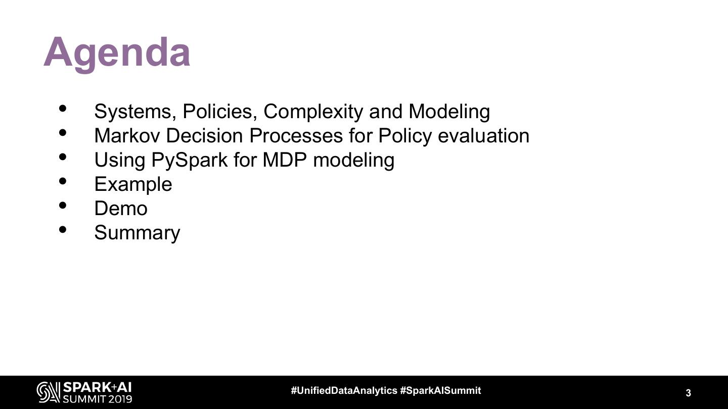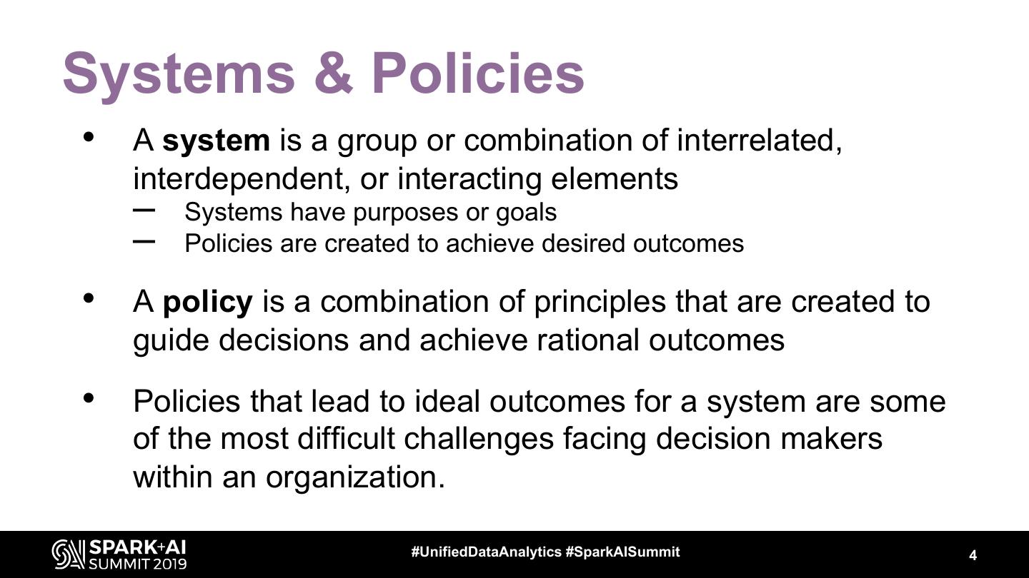 3 .Agenda • Systems, Policies, Complexity and Modeling • Markov Decision Processes for Policy evaluation • Using PySpark for MDP modeling • Example • Demo • Summary #UnifiedDataAnalytics #SparkAISummit 3