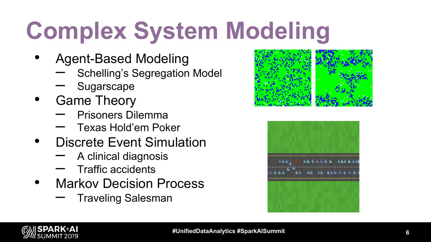 6 .Complex System Modeling • Agent-Based Modeling – Schelling’s Segregation Model – Sugarscape • Game Theory – Prisoners Dilemma – Texas Hold’em Poker • Discrete Event Simulation – A clinical diagnosis – Traffic accidents • Markov Decision Process – Traveling Salesman #UnifiedDataAnalytics #SparkAISummit 6