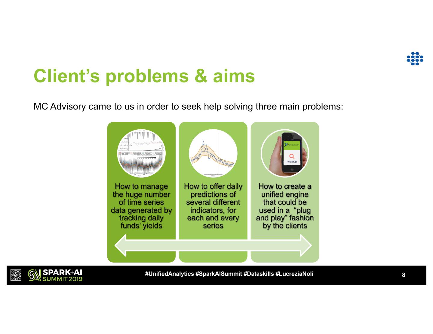 7 .MC Advisory Financial consulting firm, with a main differenciating asset: Robo4Advisor Ø It’s a tool ideated for constructing an optimal funds’ portfolio. It helps professional financial advisors to better serve their clients Ø It has two main traits: Funds’ Selection Filter & Optimal Portfolio Builder Fund Selection: § Optimized selection based on markets § Innovative engine based on client’s requirements: stability, yield, etc. Optimal Portfolio Builder: § Based on proprietary solution ideated by Dataskills, which predicts funds’ performances by monitoring various performance metrics. The engine works as a plug-and-play tool, but is optimized for each and every single fund, as if each of them had a dedicated model. #UnifiedAnalytics #SparkAISummit #Dataskills #LucreziaNoli 7