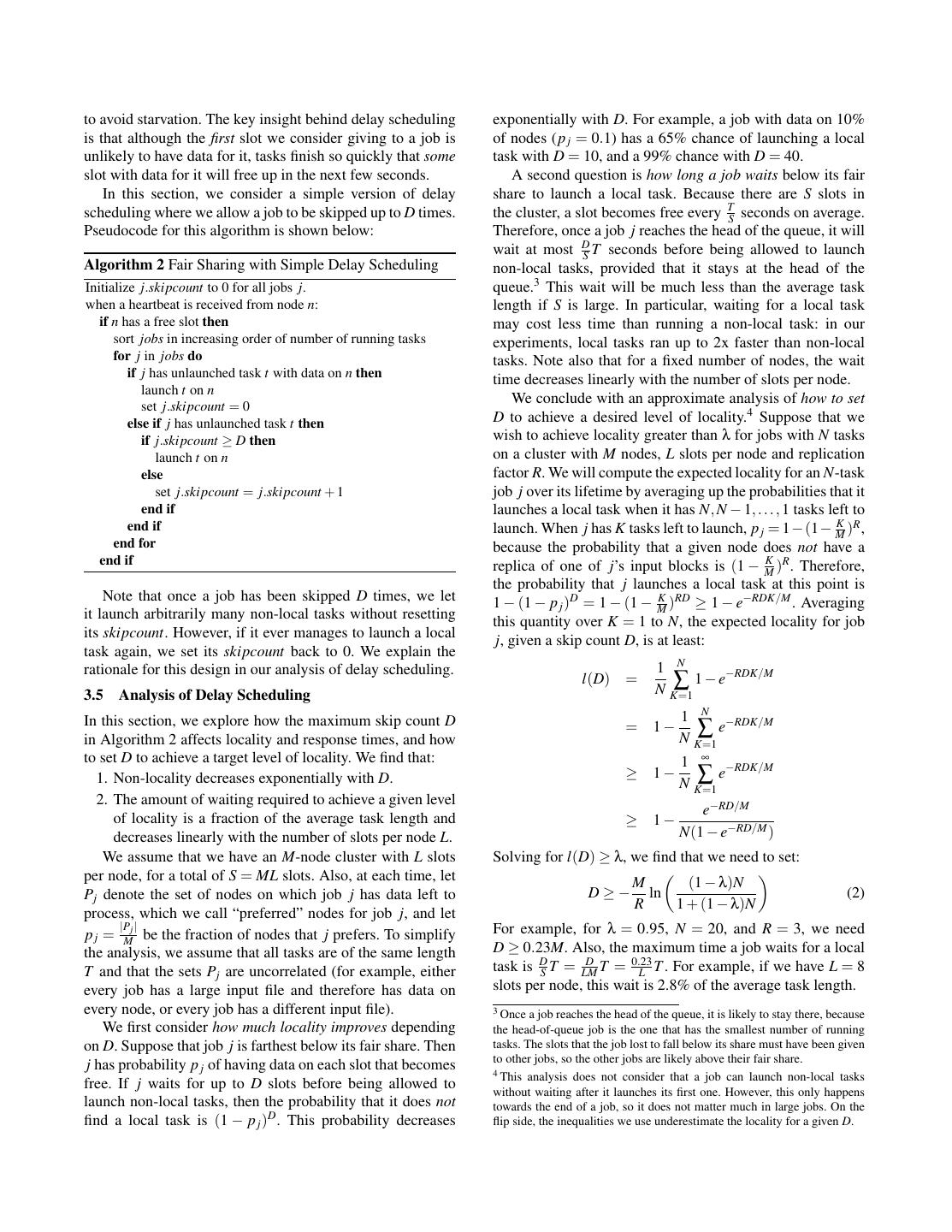 5 .to avoid starvation. The key insight behind delay scheduling exponentially with D. For example, a job with data on 10% is that although the first slot we consider giving to a job is of nodes (p j = 0.1) has a 65% chance of launching a local unlikely to have data for it, tasks finish so quickly that some task with D = 10, and a 99% chance with D = 40. slot with data for it will free up in the next few seconds. A second question is how long a job waits below its fair In this section, we consider a simple version of delay share to launch a local task. Because there are S slots in scheduling where we allow a job to be skipped up to D times. the cluster, a slot becomes free every TS seconds on average. Pseudocode for this algorithm is shown below: Therefore, once a job j reaches the head of the queue, it will wait at most DS T seconds before being allowed to launch Algorithm 2 Fair Sharing with Simple Delay Scheduling non-local tasks, provided that it stays at the head of the Initialize j.skipcount to 0 for all jobs j. queue.3 This wait will be much less than the average task when a heartbeat is received from node n: length if S is large. In particular, waiting for a local task if n has a free slot then may cost less time than running a non-local task: in our sort jobs in increasing order of number of running tasks experiments, local tasks ran up to 2x faster than non-local for j in jobs do tasks. Note also that for a fixed number of nodes, the wait if j has unlaunched task t with data on n then time decreases linearly with the number of slots per node. launch t on n We conclude with an approximate analysis of how to set set j.skipcount = 0 else if j has unlaunched task t then D to achieve a desired level of locality.4 Suppose that we if j.skipcount ≥ D then wish to achieve locality greater than λ for jobs with N tasks launch t on n on a cluster with M nodes, L slots per node and replication else factor R. We will compute the expected locality for an N-task set j.skipcount = j.skipcount + 1 job j over its lifetime by averaging up the probabilities that it end if launches a local task when it has N, N − 1, . . . , 1 tasks left to end if K R launch. When j has K tasks left to launch, p j = 1−(1− M ) , end for because the probability that a given node does not have a end if replica of one of j’s input blocks is (1 − M K R ) . Therefore, the probability that j launches a local task at this point is Note that once a job has been skipped D times, we let 1 − (1 − p j )D = 1 − (1 − M ) ≥ 1 − e−RDK/M . Averaging K RD it launch arbitrarily many non-local tasks without resetting this quantity over K = 1 to N, the expected locality for job its skipcount. However, if it ever manages to launch a local j, given a skip count D, is at least: task again, we set its skipcount back to 0. We explain the rationale for this design in our analysis of delay scheduling. 1 N l(D) = ∑ 1 − e−RDK/M N K=1 3.5 Analysis of Delay Scheduling In this section, we explore how the maximum skip count D 1 N −RDK/M = 1− ∑e in Algorithm 2 affects locality and response times, and how N K=1 to set D to achieve a target level of locality. We find that: 1 ∞ −RDK/M 1. Non-locality decreases exponentially with D. ≥ 1− ∑e N K=1 2. The amount of waiting required to achieve a given level e−RD/M of locality is a fraction of the average task length and ≥ 1− decreases linearly with the number of slots per node L. N(1 − e−RD/M ) We assume that we have an M-node cluster with L slots Solving for l(D) ≥ λ, we find that we need to set: per node, for a total of S = ML slots. Also, at each time, let M (1 − λ)N Pj denote the set of nodes on which job j has data left to D≥− ln (2) R 1 + (1 − λ)N process, which we call “preferred” nodes for job j, and let |P | For example, for λ = 0.95, N = 20, and R = 3, we need p j = Mj be the fraction of nodes that j prefers. To simplify the analysis, we assume that all tasks are of the same length D ≥ 0.23M. Also, the maximum time a job waits for a local T and that the sets Pj are uncorrelated (for example, either task is DS T = LM D T = 0.23 L T . For example, if we have L = 8 every job has a large input file and therefore has data on slots per node, this wait is 2.8% of the average task length. every node, or every job has a different input file). 3 Once a job reaches the head of the queue, it is likely to stay there, because We first consider how much locality improves depending the head-of-queue job is the one that has the smallest number of running on D. Suppose that job j is farthest below its fair share. Then tasks. The slots that the job lost to fall below its share must have been given to other jobs, so the other jobs are likely above their fair share. j has probability p j of having data on each slot that becomes 4 This analysis does not consider that a job can launch non-local tasks free. If j waits for up to D slots before being allowed to without waiting after it launches its first one. However, this only happens launch non-local tasks, then the probability that it does not towards the end of a job, so it does not matter much in large jobs. On the find a local task is (1 − p j )D . This probability decreases flip side, the inequalities we use underestimate the locality for a given D.