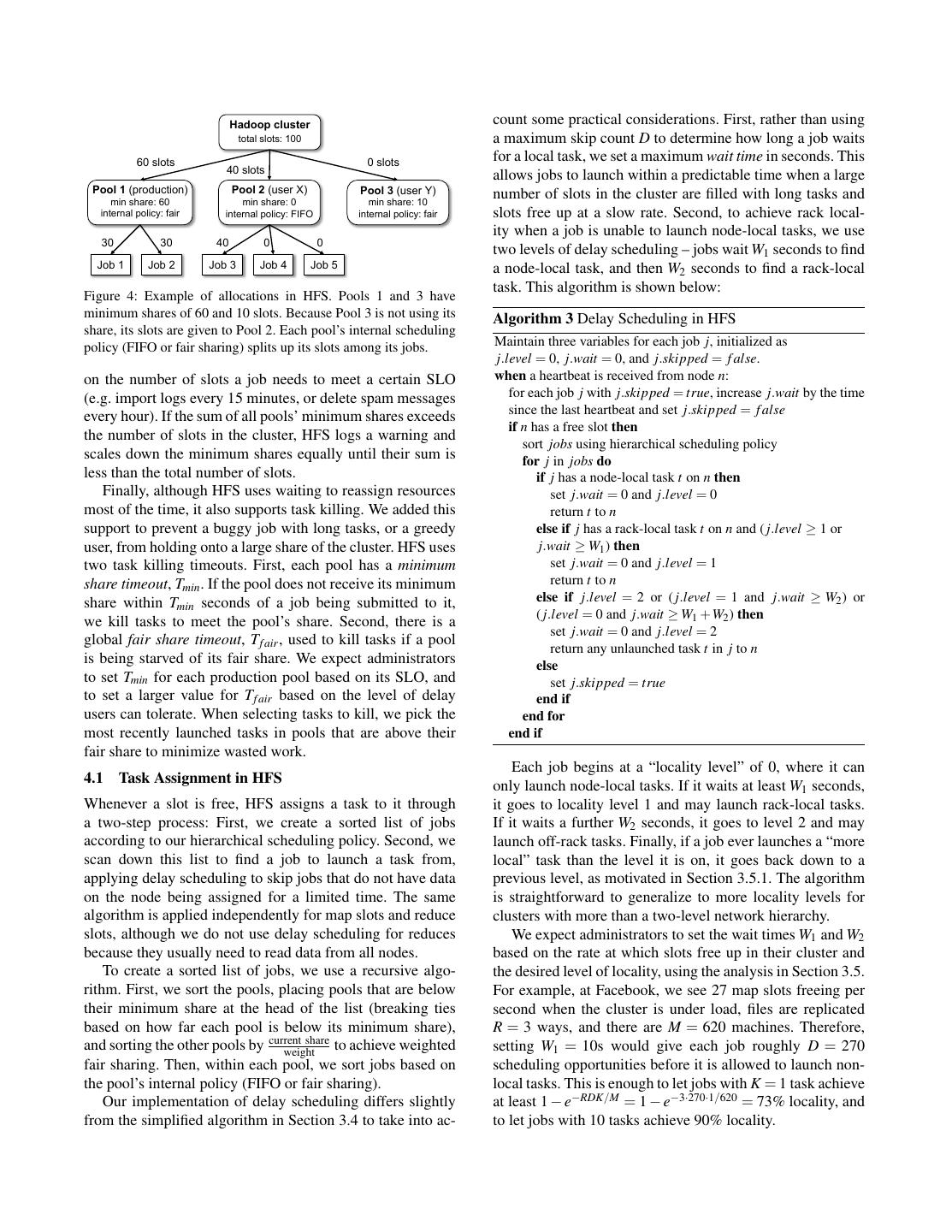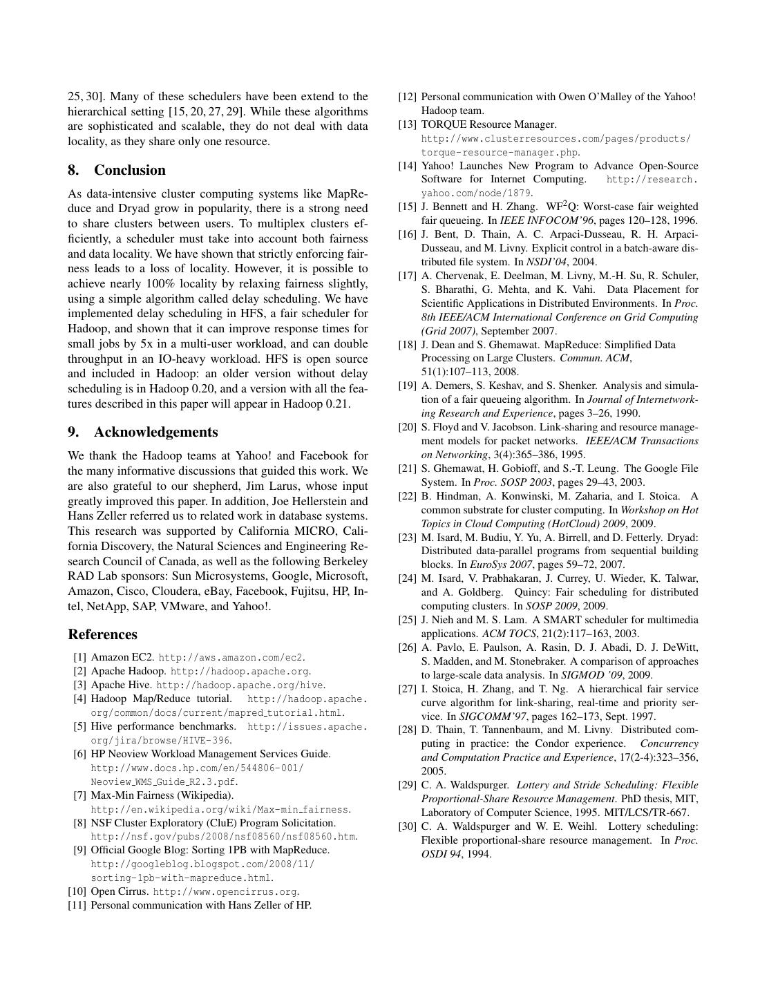 14 .25, 30]. Many of these schedulers have been extend to the [12] Personal communication with Owen O’Malley of the Yahoo! hierarchical setting [15, 20, 27, 29]. While these algorithms Hadoop team. are sophisticated and scalable, they do not deal with data [13] TORQUE Resource Manager. locality, as they share only one resource. http://www.clusterresources.com/pages/products/ torque-resource-manager.php. 8. Conclusion [14] Yahoo! Launches New Program to Advance Open-Source Software for Internet Computing. http://research. As data-intensive cluster computing systems like MapRe- yahoo.com/node/1879. duce and Dryad grow in popularity, there is a strong need [15] J. Bennett and H. Zhang. WF2 Q: Worst-case fair weighted to share clusters between users. To multiplex clusters ef- fair queueing. In IEEE INFOCOM’96, pages 120–128, 1996. ficiently, a scheduler must take into account both fairness [16] J. Bent, D. Thain, A. C. Arpaci-Dusseau, R. H. Arpaci- Dusseau, and M. Livny. Explicit control in a batch-aware dis- and data locality. We have shown that strictly enforcing fair- tributed file system. In NSDI’04, 2004. ness leads to a loss of locality. However, it is possible to [17] A. Chervenak, E. Deelman, M. Livny, M.-H. Su, R. Schuler, achieve nearly 100% locality by relaxing fairness slightly, S. Bharathi, G. Mehta, and K. Vahi. Data Placement for using a simple algorithm called delay scheduling. We have Scientific Applications in Distributed Environments. In Proc. implemented delay scheduling in HFS, a fair scheduler for 8th IEEE/ACM International Conference on Grid Computing Hadoop, and shown that it can improve response times for (Grid 2007), September 2007. small jobs by 5x in a multi-user workload, and can double [18] J. Dean and S. Ghemawat. MapReduce: Simplified Data throughput in an IO-heavy workload. HFS is open source Processing on Large Clusters. Commun. ACM, and included in Hadoop: an older version without delay 51(1):107–113, 2008. scheduling is in Hadoop 0.20, and a version with all the fea- [19] A. Demers, S. Keshav, and S. Shenker. Analysis and simula- tures described in this paper will appear in Hadoop 0.21. tion of a fair queueing algorithm. In Journal of Internetwork- ing Research and Experience, pages 3–26, 1990. [20] S. Floyd and V. Jacobson. Link-sharing and resource manage- 9. Acknowledgements ment models for packet networks. IEEE/ACM Transactions We thank the Hadoop teams at Yahoo! and Facebook for on Networking, 3(4):365–386, 1995. the many informative discussions that guided this work. We [21] S. Ghemawat, H. Gobioff, and S.-T. Leung. The Google File are also grateful to our shepherd, Jim Larus, whose input System. In Proc. SOSP 2003, pages 29–43, 2003. greatly improved this paper. In addition, Joe Hellerstein and [22] B. Hindman, A. Konwinski, M. Zaharia, and I. Stoica. A common substrate for cluster computing. In Workshop on Hot Hans Zeller referred us to related work in database systems. Topics in Cloud Computing (HotCloud) 2009, 2009. This research was supported by California MICRO, Cali- [23] M. Isard, M. Budiu, Y. Yu, A. Birrell, and D. Fetterly. Dryad: fornia Discovery, the Natural Sciences and Engineering Re- Distributed data-parallel programs from sequential building search Council of Canada, as well as the following Berkeley blocks. In EuroSys 2007, pages 59–72, 2007. RAD Lab sponsors: Sun Microsystems, Google, Microsoft, [24] M. Isard, V. Prabhakaran, J. Currey, U. Wieder, K. Talwar, Amazon, Cisco, Cloudera, eBay, Facebook, Fujitsu, HP, In- and A. Goldberg. Quincy: Fair scheduling for distributed tel, NetApp, SAP, VMware, and Yahoo!. computing clusters. In SOSP 2009, 2009. [25] J. Nieh and M. S. Lam. A SMART scheduler for multimedia References applications. ACM TOCS, 21(2):117–163, 2003. [26] A. Pavlo, E. Paulson, A. Rasin, D. J. Abadi, D. J. DeWitt, [1] Amazon EC2. http://aws.amazon.com/ec2. S. Madden, and M. Stonebraker. A comparison of approaches [2] Apache Hadoop. http://hadoop.apache.org. to large-scale data analysis. In SIGMOD ’09, 2009. [3] Apache Hive. http://hadoop.apache.org/hive. [27] I. Stoica, H. Zhang, and T. Ng. A hierarchical fair service [4] Hadoop Map/Reduce tutorial. http://hadoop.apache. curve algorithm for link-sharing, real-time and priority ser- org/common/docs/current/mapred tutorial.html. vice. In SIGCOMM’97, pages 162–173, Sept. 1997. [5] Hive performance benchmarks. http://issues.apache. [28] D. Thain, T. Tannenbaum, and M. Livny. Distributed com- org/jira/browse/HIVE-396. puting in practice: the Condor experience. Concurrency [6] HP Neoview Workload Management Services Guide. and Computation Practice and Experience, 17(2-4):323–356, http://www.docs.hp.com/en/544806-001/ 2005. Neoview WMS Guide R2.3.pdf. [29] C. A. Waldspurger. Lottery and Stride Scheduling: Flexible [7] Max-Min Fairness (Wikipedia). Proportional-Share Resource Management. PhD thesis, MIT, http://en.wikipedia.org/wiki/Max-min fairness. Laboratory of Computer Science, 1995. MIT/LCS/TR-667. [8] NSF Cluster Exploratory (CluE) Program Solicitation. [30] C. A. Waldspurger and W. E. Weihl. Lottery scheduling: http://nsf.gov/pubs/2008/nsf08560/nsf08560.htm. Flexible proportional-share resource management. In Proc. [9] Official Google Blog: Sorting 1PB with MapReduce. OSDI 94, 1994. http://googleblog.blogspot.com/2008/11/ sorting-1pb-with-mapreduce.html. [10] Open Cirrus. http://www.opencirrus.org. [11] Personal communication with Hans Zeller of HP.