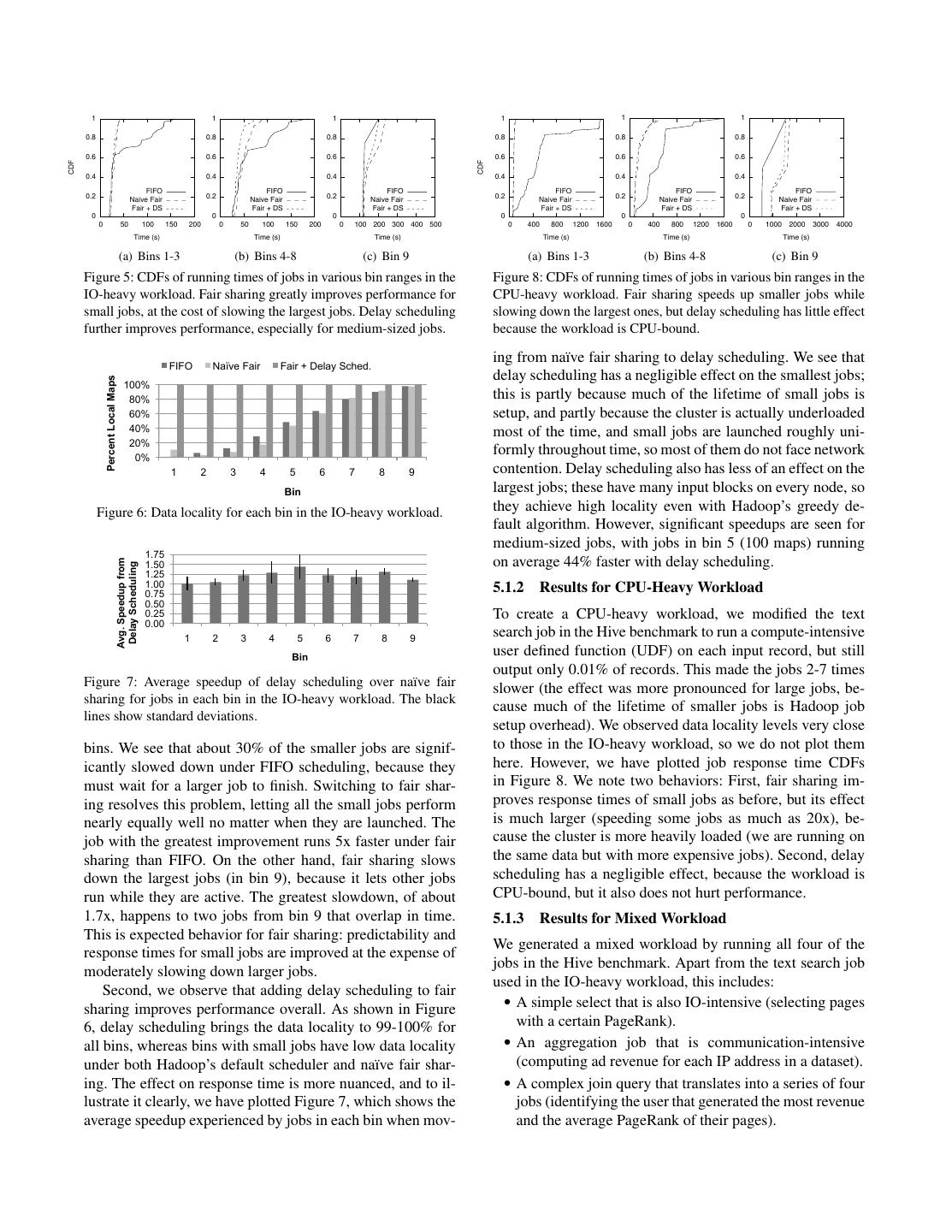 10 . Bin Job Type Map Tasks Reduce Tasks # Jobs Run Naive Fair over FIFO Fair + DS over FIFO 1 select 1 NA 38 6.0 2 text search 2 NA 16 5.0 Average Speedup 3 aggregation 10 3 14 4 select 50 NA 8 4.0 5 text search 100 NA 6 3.0 6 aggregation 200 50 6 2.0 7 select 400 NA 4 8 aggregation 800 180 4 1.0 9 join 2400 360 2 0.0 10 text search 4800 NA 2 1 2 3 4 5 6 7 8 9 10 Bin Table 3: Job types and sizes for each bin in our mixed workload. Figure 10: Average speedup of na¨ıve fair sharing and fair sharing 1 1 1 with delay scheduling over FIFO for jobs in each bin in the mixed 0.8 0.8 0.8 workload. The black lines show standard deviations. 0.6 0.6 0.6 ations where locality is difficult to achieve. For these ex- CDF CDF CDF 0.4 0.4 0.4 periments, we used a “scan” included in Hadoop’s GridMix FIFO FIFO FIFO 0.2 Naive Fair Fair + DS 0.2 Naive Fair Fair + DS 0.2 Naive Fair Fair + DS benchmark. This is a synthetic job in which each map out- 0 0 100 200 300 400 500 600 0 0 100 200 300 400 500 0 0 200 400 600 800 1000 puts 0.5% of its input records, similar to the text search job in Time (s) Time (s) Time (s) the macrobenchmarks. As such, it is a suitable workload for (a) Bins 1-3 (b) Bins 4-8 (c) Bins 9-10 stress-testing data locality because it is IO-bound. The scan Figure 9: CDFs of running times of jobs in various bin ranges in job normally has one reduce task that counts the results, but the mixed workload. we also ran some experiments with no reduces (saving map outputs as the job’s output) to emulate pure filtering jobs. For this experiment, we split bin 9 into two smaller bins, 5.2.1 Hierarchical Scheduling one of which contained 2 join jobs (which translate into a large 2400-map job followed by three smaller jobs each) and To evaluate the hierarchical scheduling policy in HFS and another of which contained two 4800-map jobs as before. measure how quickly resources are given to new jobs, we We list the job we used as a representative in each bin in set up three pools on the EC2 cluster. Pools 1 and 2 used Table 3. Unlike our first two workloads, which had map-only fair sharing as their internal policy, while pool 3 used FIFO. jobs, this workload also contained jobs with reduce tasks, so We then submitted a sequence of jobs to test both sharing be- we also list the number of reduce tasks per job. tween pools and scheduling within a pool. Figure 11 shows a We plot CDFs of job response times in each bin in Figure timeline of the experiment. Delay scheduling (with W1 = 5s) 9. As in the previous experiments, fair sharing significantly was also enabled, and all jobs achieved 99-100% locality. improves the response time for smaller jobs, while slightly We used two types of filter jobs: two long jobs with long slowing larger jobs. Because the aggregation jobs take tasks (12000 map tasks that each took 25s on average) and longer than map-only jobs (due to having a communication- four jobs with short tasks (800 map tasks that each took 12s heavy reduce phase), we have also plotted the speedups on average). To make the first type of jobs have longer tasks, achieved by each bin separately in Figure 10. The dark bars we set their filtering rate to 50% instead of 0.5%. show speedups for na¨ıve fair sharing over FIFO, while the We began by submitting a long-task job to pool 1 at time light bars show speedups for fair sharing with delay schedul- 0. This job was given tasks on all the nodes in the cluster. ing over FIFO. The smaller map-only jobs (bins 1 and 2) Then, at time 57s, we submitted a second long-task job in achieve significant speedups from fair sharing. Bin 3 does pool 2. This job reached its fair share (half the cluster) in not achieve a speedup as high as in other experiments be- 17 seconds. Then, at time 118s, we submitted three short- cause the jobs are longer (the median one is about 100 sec- task jobs to pool 3. The pool ran acquired 33% of the slots onds, while the median in bins 1 and 2 is 32 seconds with in the cluster in 12 seconds and scheduled its jobs in FIFO delay scheduling). However, in all but the largest bins, jobs order, so that as soon as the first job finished tasks, slots benefit from both fair sharing and delay scheduling. We also were given to the second job. Once pool 3’s jobs finished, the see that the benefits from delay scheduling are larger for the cluster returned to being shared equally between pools 1 and bins with IO-intensive jobs (1, 2, 4, 5, 7 and 10) than for 2. Finally, at time 494s, we submitted a second job in pool bins where there are also reduce tasks (and hence a smaller 1. Because pool 1 was configured to perform fair sharing, it fraction of the job running time is spent reading input). split up its slots between its jobs, giving them 25% of the slots each, while pool 2’s share remained 50%. 5.2 Microbenchmarks Note that the graph in Figure 11 shows a “bump” in the We ran several microbenchmarks to test HFS in a more con- share of pool 2 twenty seconds after it starts running jobs, trolled manner, and to stress-test delay scheduling in situ- and a smaller bump when pool 3 starts. These bumps occur