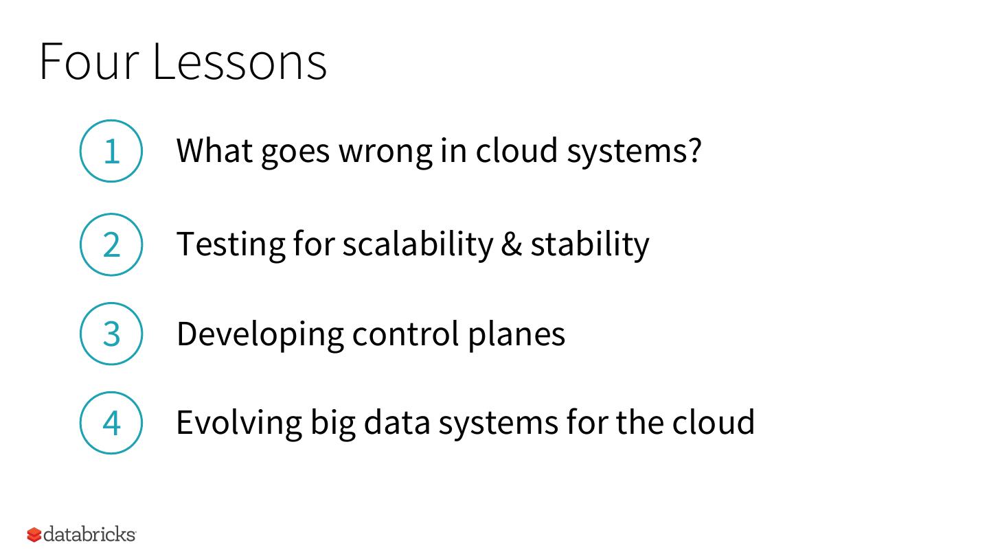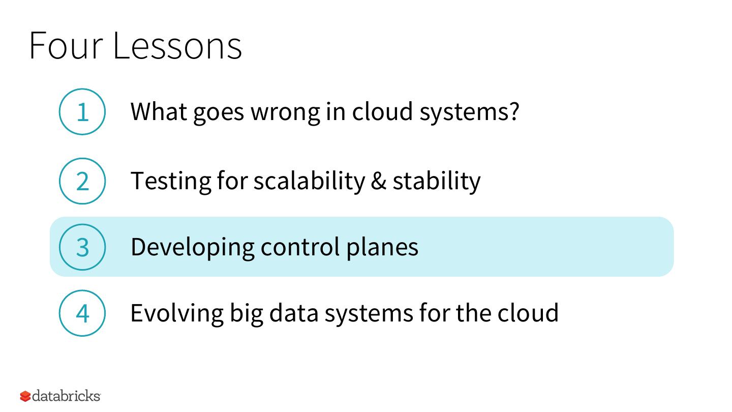 17 .Four Lessons 1 What goes wrong in cloud systems? 2 Testing for scalability & stability 3 Developing control planes 4 Evolving big data systems for the cloud 17