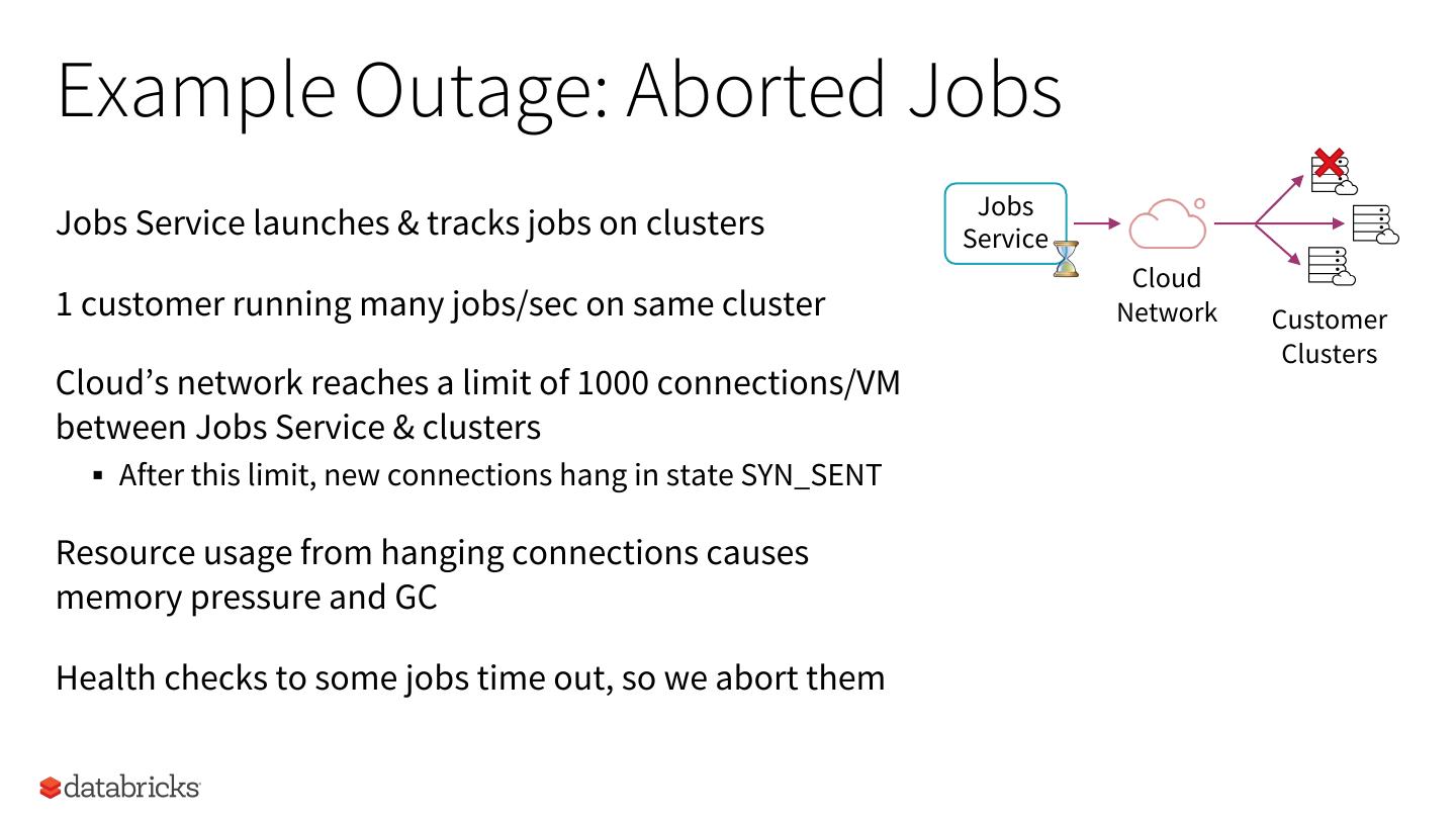 22 .Example Outage: Aborted Jobs Jobs Jobs Service launches & tracks jobs on clusters Service Cloud 1 customer running many jobs/sec on same cluster Network Customer Clusters Cloud’s network reaches a limit of 1000 connections/VM between Jobs Service & clusters § After this limit, new connections hang in state SYN_SENT Resource usage from hanging connections causes memory pressure and GC Health checks to some jobs time out, so we abort them 22