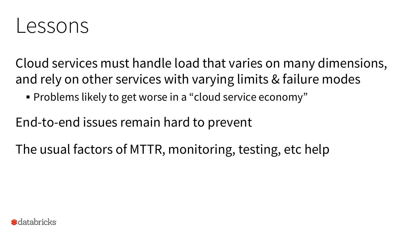 24 .Lessons Cloud services must handle load that varies on many dimensions, and rely on other services with varying limits & failure modes § Problems likely to get worse in a “cloud service economy” End-to-end issues remain hard to prevent The usual factors of MTTR, monitoring, testing, etc help 24