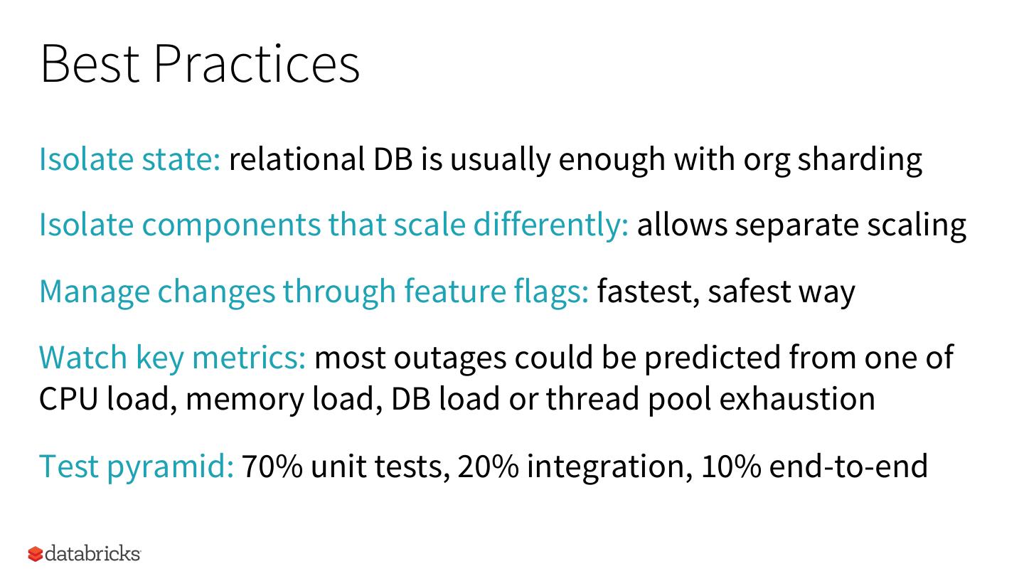 28 .Databricks Stress Test Infrastructure 1. Identify dimensions for a system to scale in (e.g. # of users, number of output rows, size of each output row, etc) 2. Grow load in each dimension until a failure occurs 3. Record failure type and impact on system § Error message, timeout, wrong result? § Are other clients affected? § Does the system auto-recover? How fast? 4. Compare over time and on changes 28