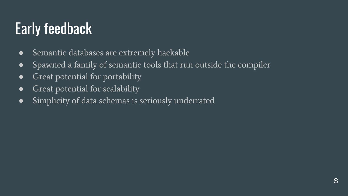 28 .Early feedback ● Semantic databases are extremely hackable ● Spawned a family of semantic tools that run outside the compiler ● Great potential for portability ● Great potential for scalability ● Simplicity of data schemas is seriously underrated S
