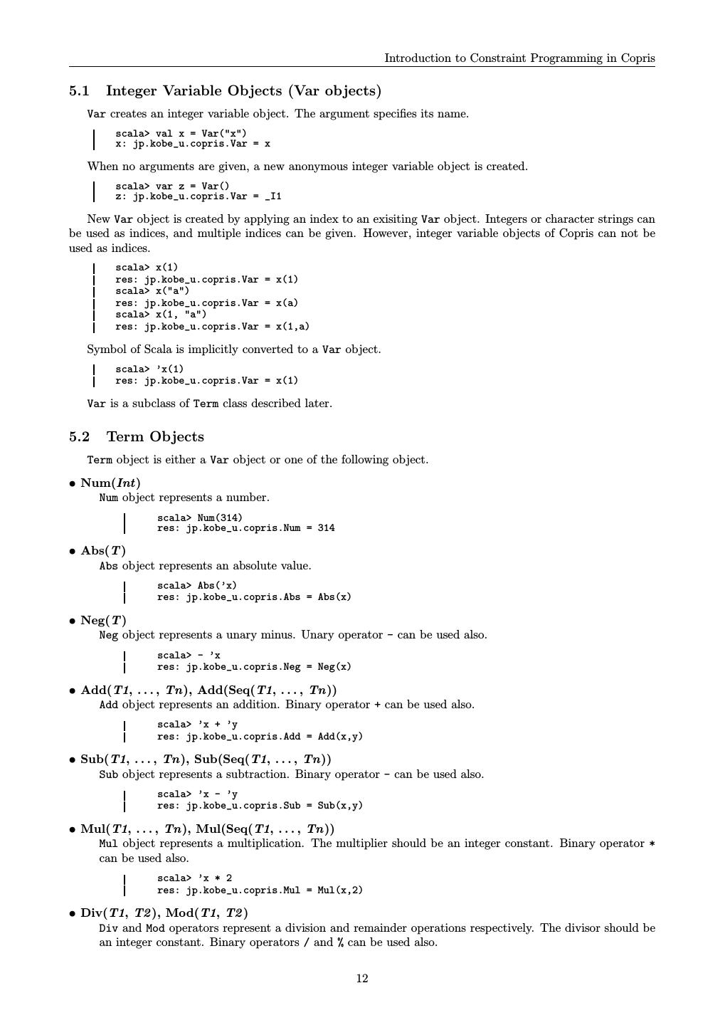 13 . Introduction to Constraint Programming in Copris 5.1 Integer Variable Objects (Var objects) Var creates an integer variable object. The argument specifies its name. scala> val x = Var("x") x: jp.kobe_u.copris.Var = x When no arguments are given, a new anonymous integer variable object is created. scala> var z = Var() z: jp.kobe_u.copris.Var = _I1 New Var object is created by applying an index to an exisiting Var object. Integers or character strings can be used as indices, and multiple indices can be given. However, integer variable objects of Copris can not be used as indices. scala> x(1) res: jp.kobe_u.copris.Var = x(1) scala> x("a") res: jp.kobe_u.copris.Var = x(a) scala> x(1, "a") res: jp.kobe_u.copris.Var = x(1,a) Symbol of Scala is implicitly converted to a Var object. scala> ’x(1) res: jp.kobe_u.copris.Var = x(1) Var is a subclass of Term class described later. 5.2 Term Objects Term object is either a Var object or one of the following object. • Num(Int) Num object represents a number. scala> Num(314) res: jp.kobe_u.copris.Num = 314 • Abs(T ) Abs object represents an absolute value. scala> Abs(’x) res: jp.kobe_u.copris.Abs = Abs(x) • Neg(T ) Neg object represents a unary minus. Unary operator - can be used also. scala> - ’x res: jp.kobe_u.copris.Neg = Neg(x) • Add(T1, . . . , Tn), Add(Seq(T1, . . . , Tn)) Add object represents an addition. Binary operator + can be used also. scala> ’x + ’y res: jp.kobe_u.copris.Add = Add(x,y) • Sub(T1, . . . , Tn), Sub(Seq(T1, . . . , Tn)) Sub object represents a subtraction. Binary operator - can be used also. scala> ’x - ’y res: jp.kobe_u.copris.Sub = Sub(x,y) • Mul(T1, . . . , Tn), Mul(Seq(T1, . . . , Tn)) Mul object represents a multiplication. The multiplier should be an integer constant. Binary operator * can be used also. scala> ’x * 2 res: jp.kobe_u.copris.Mul = Mul(x,2) • Div(T1, T2 ), Mod(T1, T2 ) Div and Mod operators represent a division and remainder operations respectively. The divisor should be an integer constant. Binary operators / and % can be used also. 12