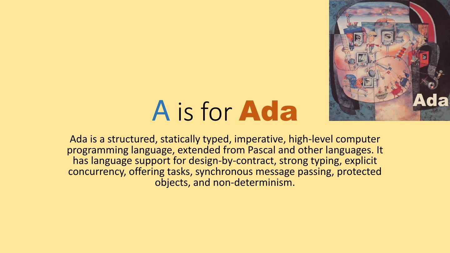 3 . A is for Ada Ada is a structured, statically typed, imperative, high-level computer programming language, extended from Pascal and other languages. It has language support for design-by-contract, strong typing, explicit concurrency, offering tasks, synchronous message passing, protected objects, and non-determinism.