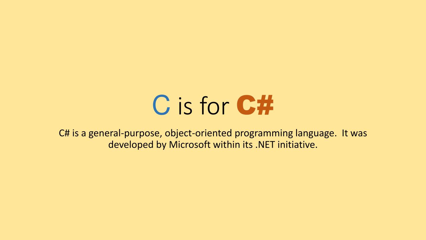 6 . C is for C# C# is a general-purpose, object-oriented programming language. It was developed by Microsoft within its .NET initiative.