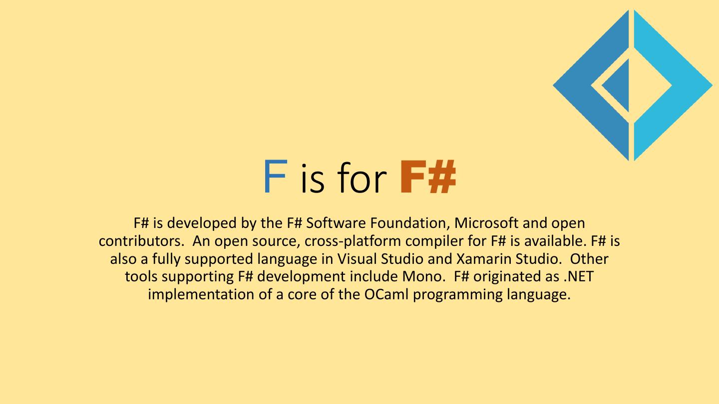 8 . F is for F# F# is developed by the F# Software Foundation, Microsoft and open contributors. An open source, cross-platform compiler for F# is available. F# is also a fully supported language in Visual Studio and Xamarin Studio. Other tools supporting F# development include Mono. F# originated as .NET implementation of a core of the OCaml programming language.