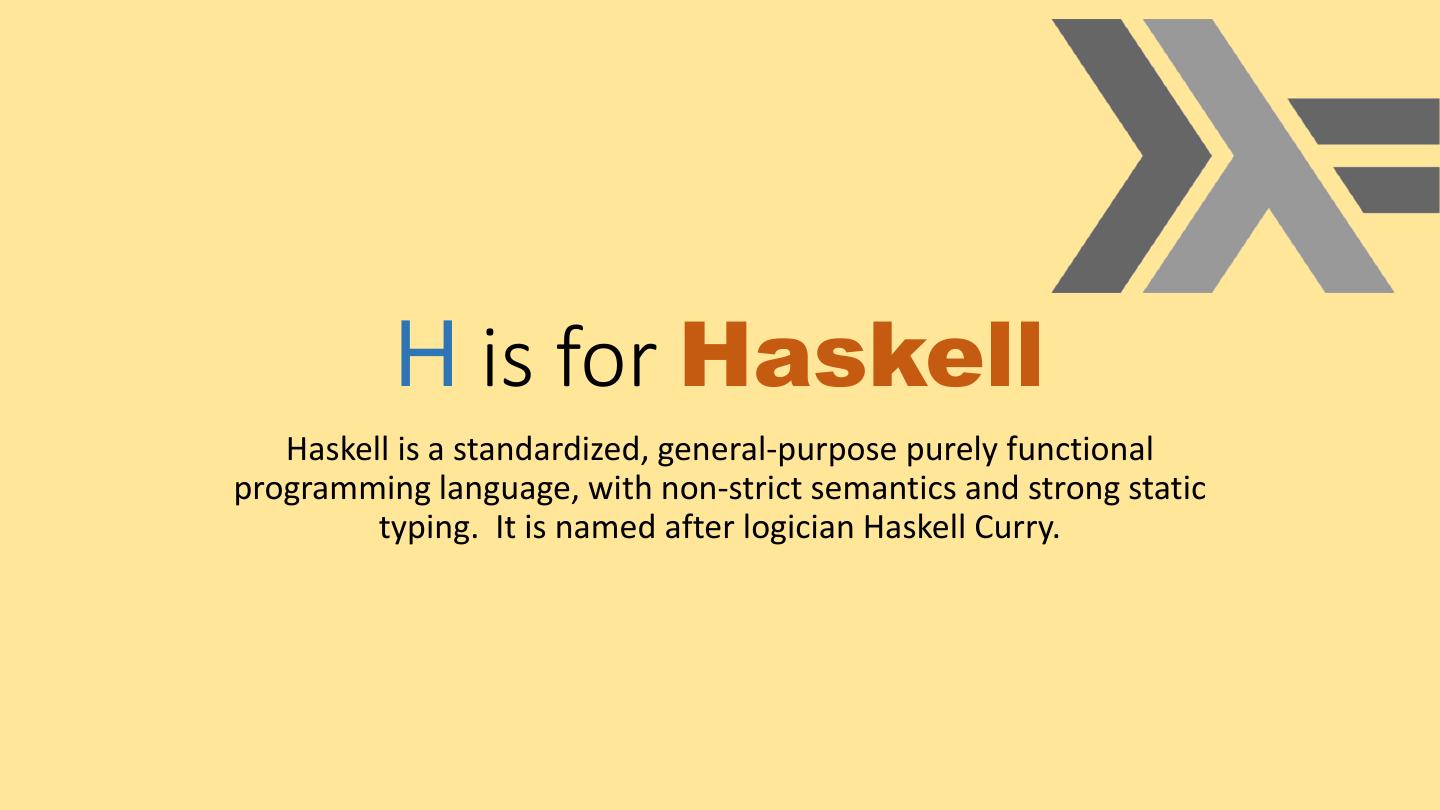 10 . H is for Haskell Haskell is a standardized, general-purpose purely functional programming language, with non-strict semantics and strong static typing. It is named after logician Haskell Curry.
