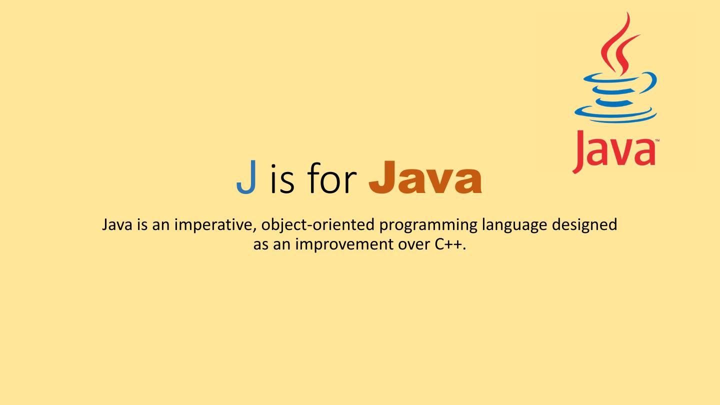 11 . J is for Java Java is an imperative, object-oriented programming language designed as an improvement over C++.
