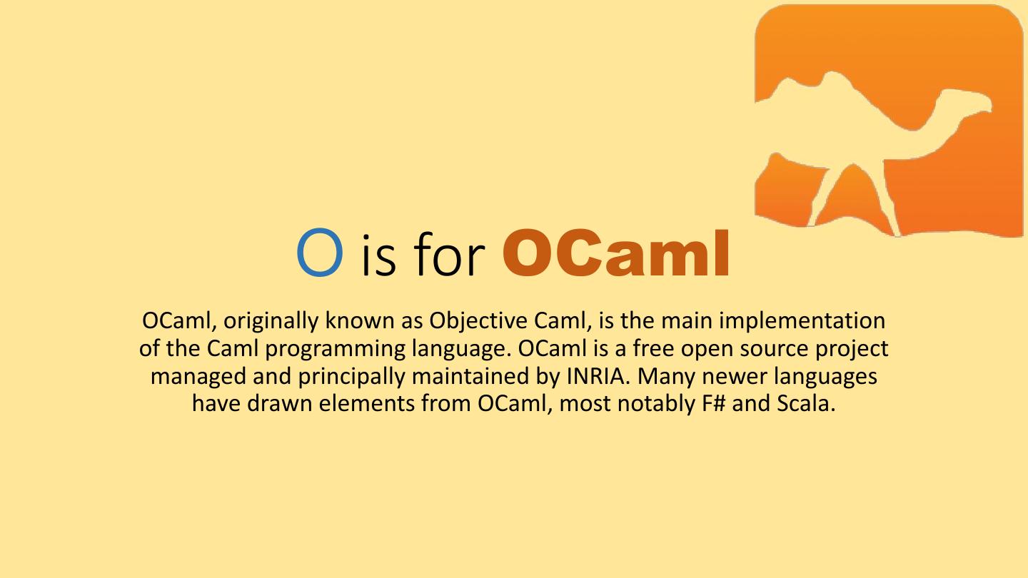 13 . O is for OCaml OCaml, originally known as Objective Caml, is the main implementation of the Caml programming language. OCaml is a free open source project managed and principally maintained by INRIA. Many newer languages have drawn elements from OCaml, most notably F# and Scala.