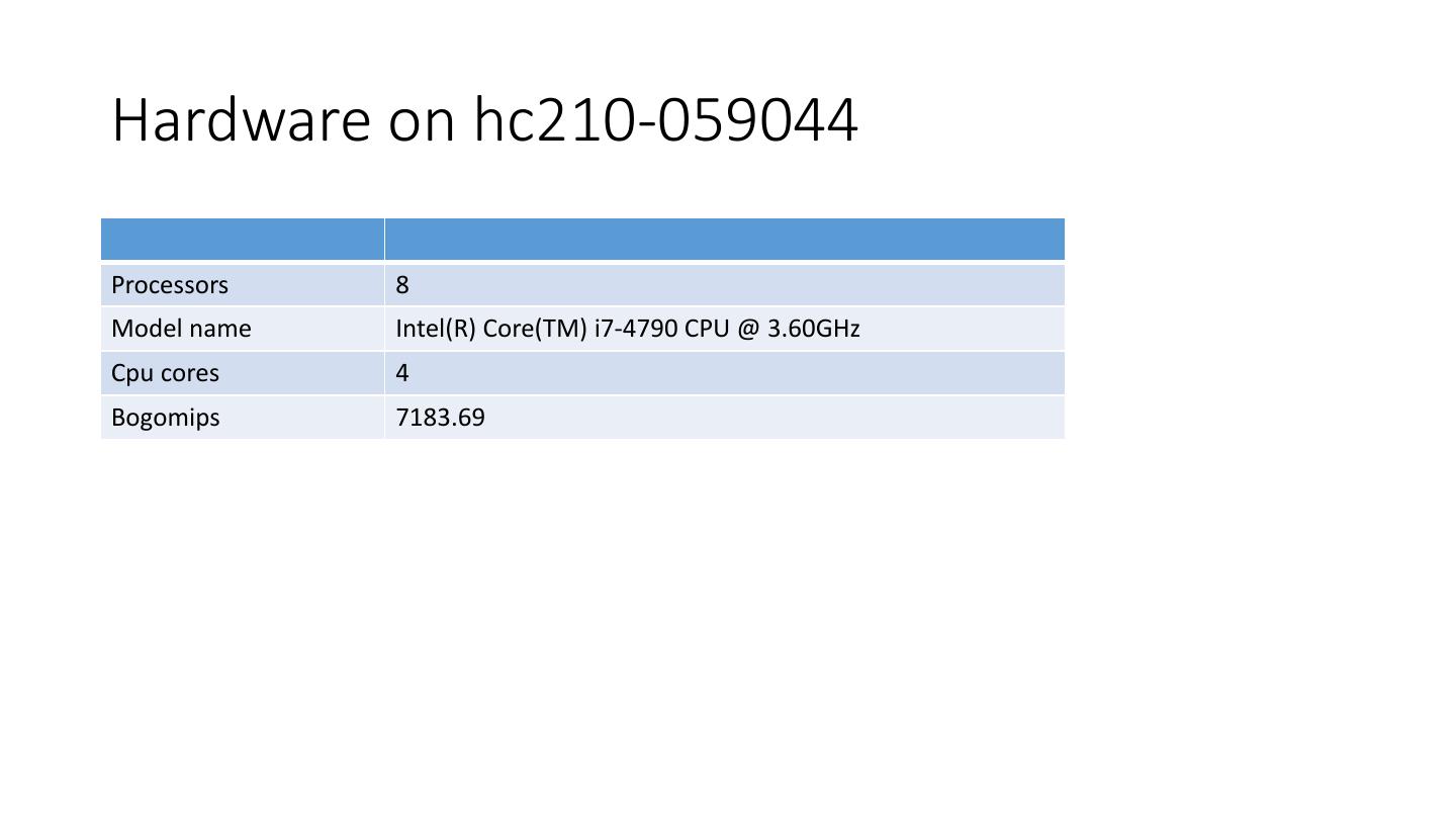 18 .Hardware on hc210-059044 Processors 8 Model name Intel(R) Core(TM) i7-4790 CPU @ 3.60GHz Cpu cores 4 Bogomips 7183.69