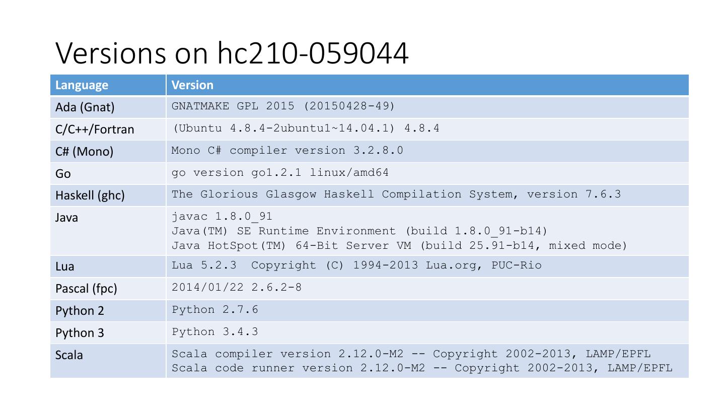 20 .Versions on hc210-059044 Language Version Ada (Gnat) GNATMAKE GPL 2015 (20150428-49) C/C++/Fortran (Ubuntu 4.8.4-2ubuntu1~14.04.1) 4.8.4 C# (Mono) Mono C# compiler version 3.2.8.0 Go go version go1.2.1 linux/amd64 Haskell (ghc) The Glorious Glasgow Haskell Compilation System, version 7.6.3 Java javac 1.8.0_91 Java(TM) SE Runtime Environment (build 1.8.0_91-b14) Java HotSpot(TM) 64-Bit Server VM (build 25.91-b14, mixed mode) Lua Lua 5.2.3 Copyright (C) 1994-2013 Lua.org, PUC-Rio Pascal (fpc) 2014/01/22 2.6.2-8 Python 2 Python 2.7.6 Python 3 Python 3.4.3 Scala Scala compiler version 2.12.0-M2 -- Copyright 2002-2013, LAMP/EPFL Scala code runner version 2.12.0-M2 -- Copyright 2002-2013, LAMP/EPFL