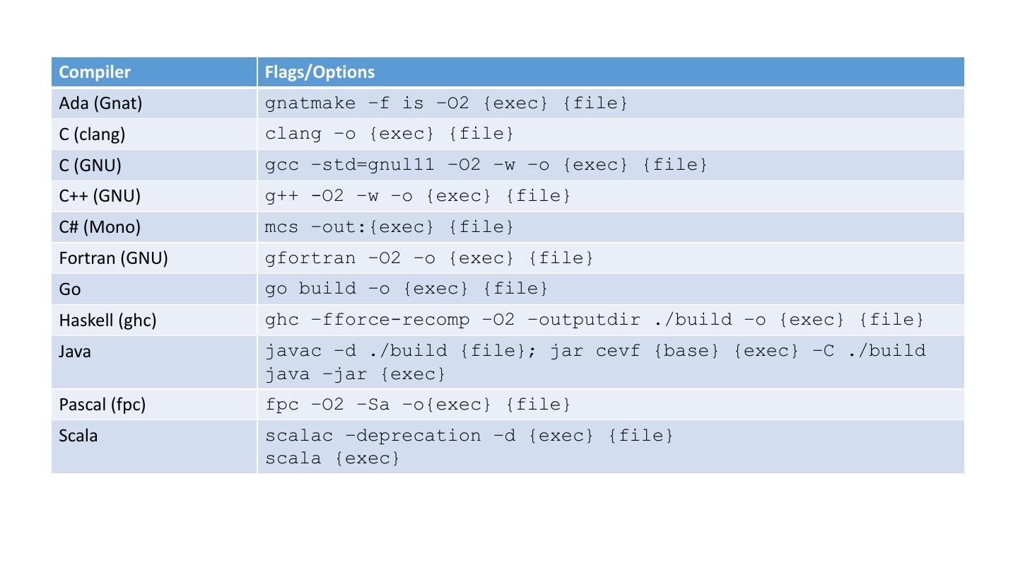 22 .Compiler Flags/Options Ada (Gnat) gnatmake –f is –O2 {exec} {file} C (clang) clang –o {exec} {file} C (GNU) gcc –std=gnul11 –O2 –w –o {exec} {file} C++ (GNU) g++ -O2 –w –o {exec} {file} C# (Mono) mcs –out:{exec} {file} Fortran (GNU) gfortran –O2 –o {exec} {file} Go go build –o {exec} {file} Haskell (ghc) ghc –fforce-recomp –O2 –outputdir ./build –o {exec} {file} Java javac –d ./build {file}; jar cevf {base} {exec} –C ./build java –jar {exec} Pascal (fpc) fpc –O2 –Sa –o{exec} {file} Scala scalac –deprecation –d {exec} {file} scala {exec}