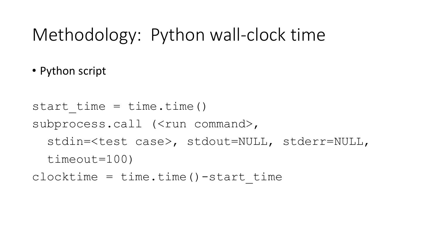 23 .Methodology: Python wall-clock time • Python script start_time = time.time() subprocess.call (<run command>, stdin=<test case>, stdout=NULL, stderr=NULL, timeout=100) clocktime = time.time()-start_time