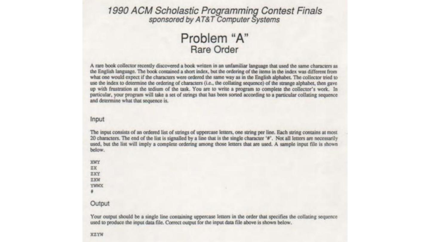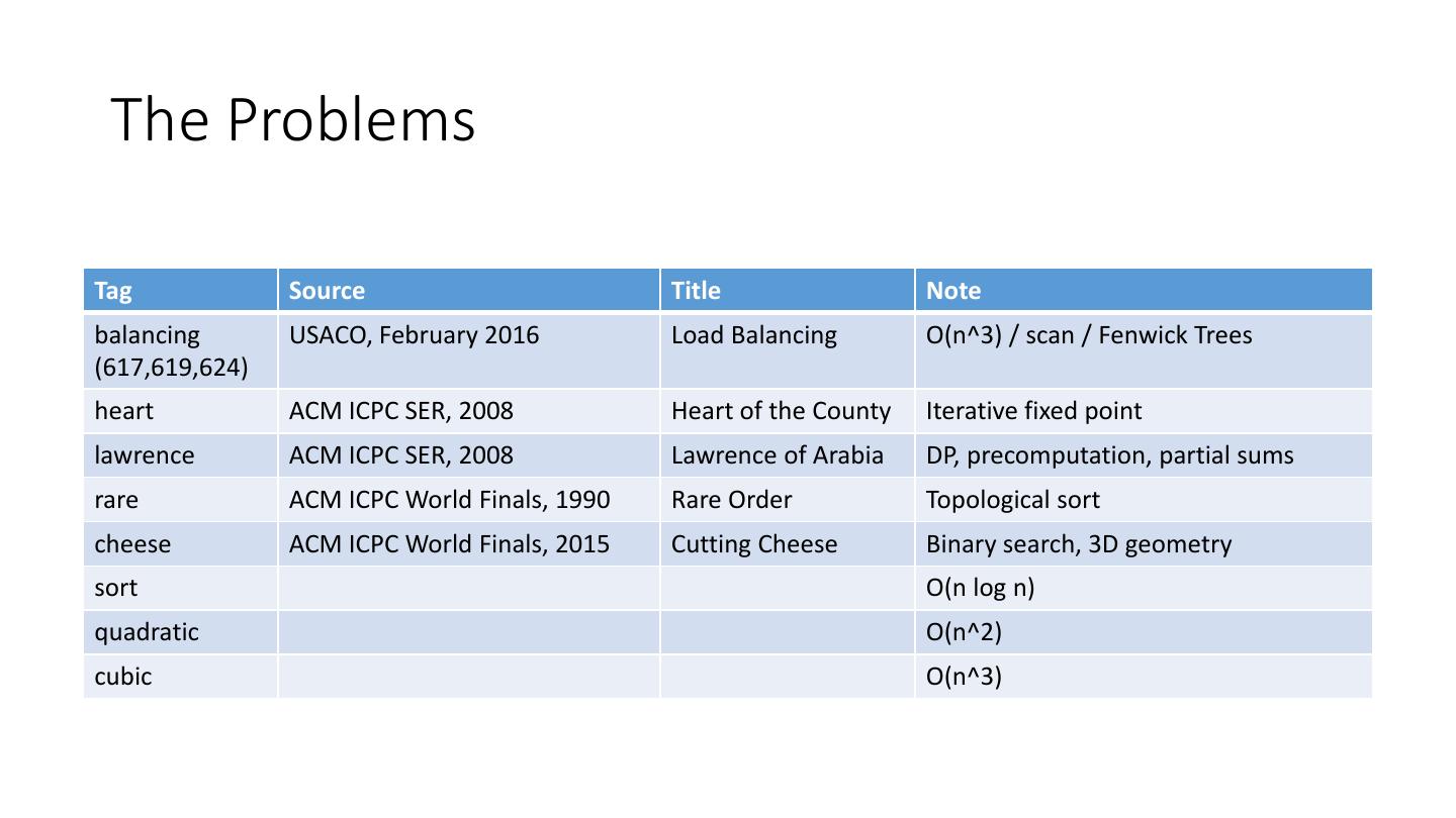 24 . The Problems Tag Source Title Note balancing USACO, February 2016 Load Balancing O(n^3) / scan / Fenwick Trees (617,619,624) heart ACM ICPC SER, 2008 Heart of the County Iterative fixed point lawrence ACM ICPC SER, 2008 Lawrence of Arabia DP, precomputation, partial sums rare ACM ICPC World Finals, 1990 Rare Order Topological sort cheese ACM ICPC World Finals, 2015 Cutting Cheese Binary search, 3D geometry sort O(n log n) quadratic O(n^2) cubic O(n^3)