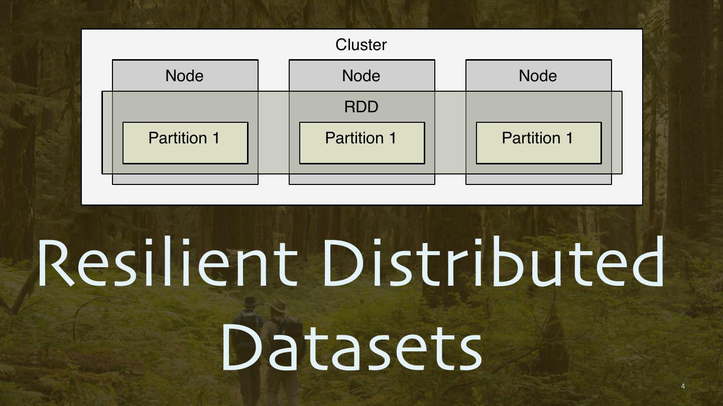 4 . Cluster Node Node Node RDD Partition 1 Partition 1 Partition 1 Resilient Distributed Datasets 4