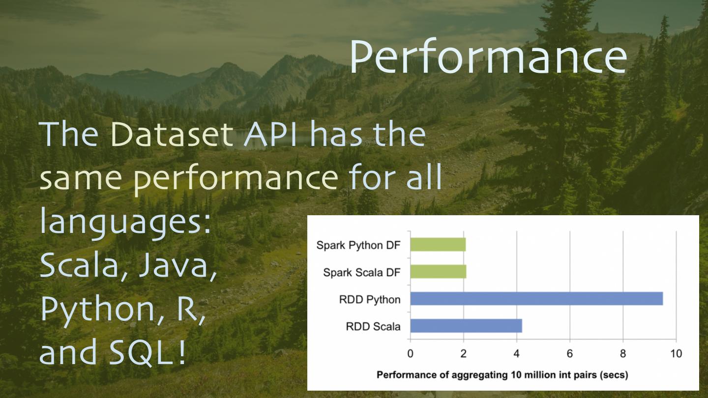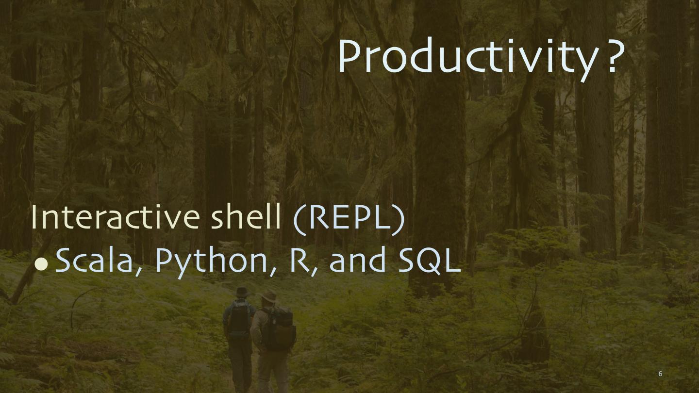 5 . Productivity? Very concise, elegant, functional APIs. •Scala, Java •Python, R •... and SQL! 5