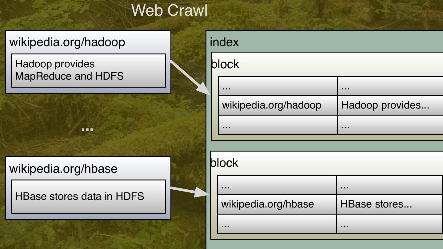 10 . Web Crawl wikipedia.org/hadoop index Hadoop provides block MapReduce and HDFS ... ... wikipedia.org/hadoop Hadoop provides... ... ... ... wikipedia.org/hbase block ... ... HBase stores data in HDFS wikipedia.org/hbase HBase stores... ... ... 10