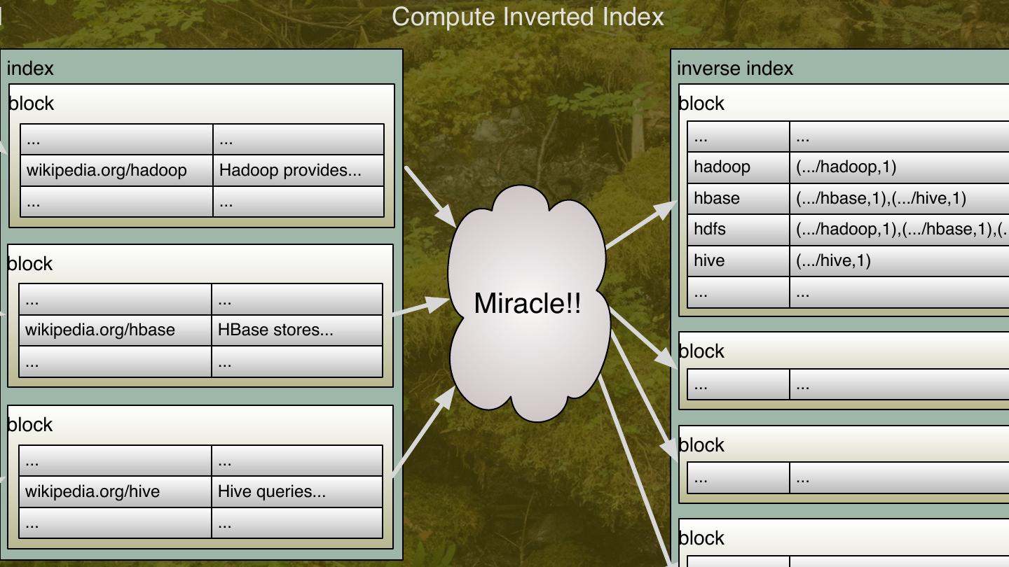 11 .l Compute Inverted Index index inverse index block block ... ... ... ... wikipedia.org/hadoop Hadoop provides... hadoop (.../hadoop,1) ... ... hbase (.../hbase,1),(.../hive,1) hdfs (.../hadoop,1),(.../hbase,1),(.. block hive (.../hive,1) ... ... ... ... Miracle!! wikipedia.org/hbase HBase stores... ... ... block ... ... block block ... ... ... ... wikipedia.org/hive Hive queries... ... ... block 11