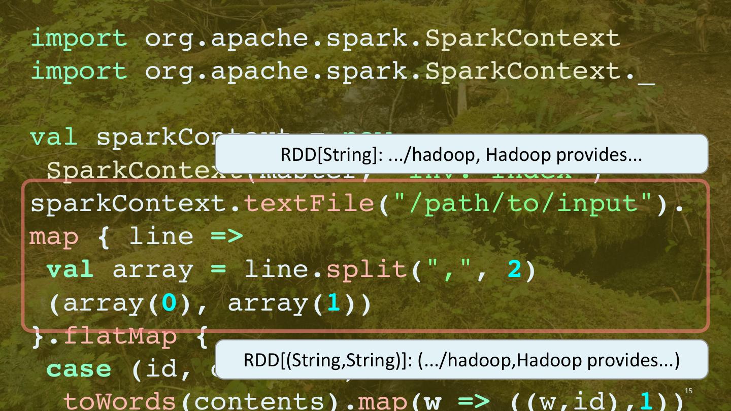 14 .import org.apache.spark.SparkContext import org.apache.spark.SparkContext._ val sparkContext = new SparkContext(master, “Inv. Index”) sparkContext.textFile("/path/to/input"). map { line => val array = line.split(",", 2) (array(0), array(1)) }.flatMap { case (id, contents) => 14 toWords(contents).map(w => ((w,id),1))