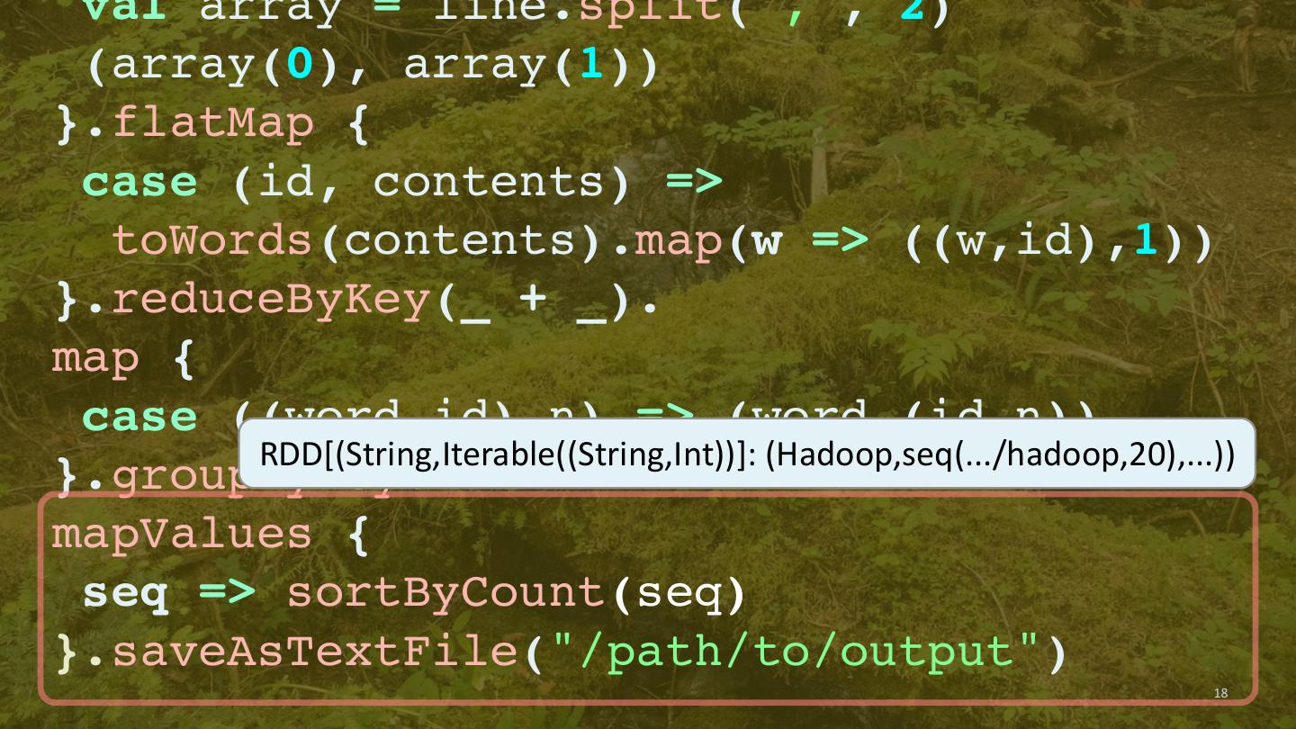 17 . val array = line.split(",", 2) (array(0), array(1)) }.flatMap { case (id, contents) => toWords(contents).map(w => ((w,id),1)) }.reduceByKey(_ + _). map { case ((word,id),n) => (word,(id,n)) }.groupByKey. mapValues { RDD[(String,Iterable((String,Int))]: (Hadoop,seq(.../hadoop,20),...)) seq => sortByCount(seq) }.saveAsTextFile("/path/to/output") 17