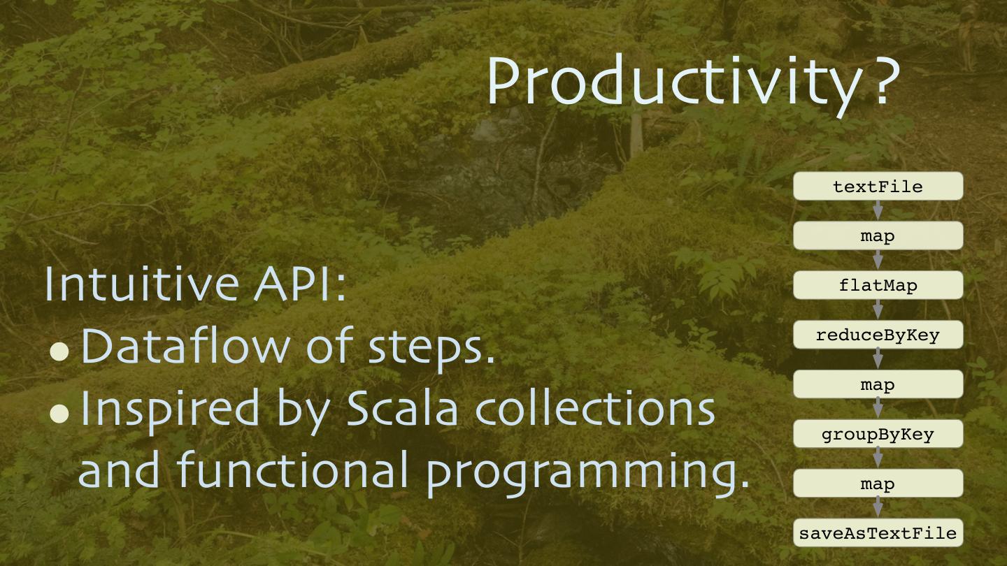 19 . Productivity? textFile map Intuitive API: flatMap •Dataflow of steps. reduceByKey map •Inspired by Scala collections groupByKey and functional programming. map saveAsTextFile 19