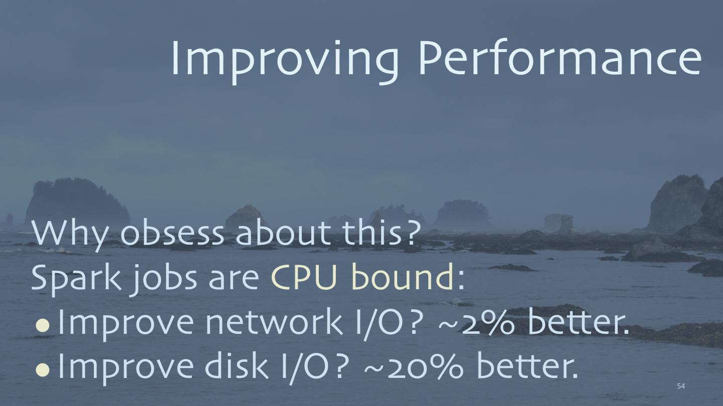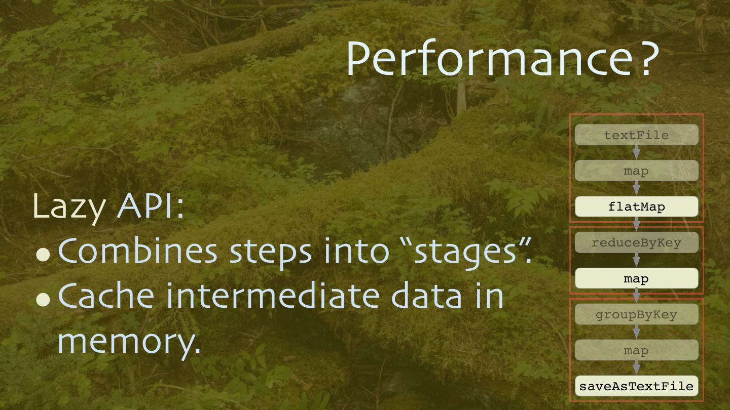 20 . Performance? textFile map Lazy API: flatMap •Combines steps into “stages”. reduceByKey map •Cache intermediate data in groupByKey memory. map saveAsTextFile 20