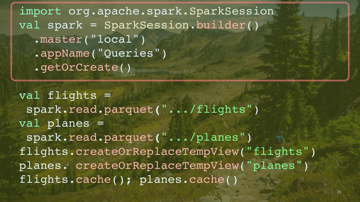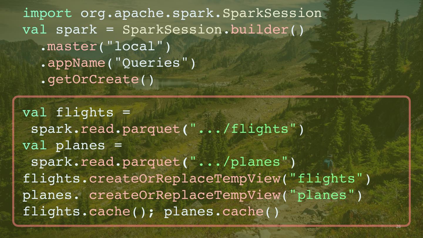 25 .import org.apache.spark.SparkSession val spark = SparkSession.builder() .master("local") .appName("Queries") .getOrCreate() val flights = spark.read.parquet(".../flights") val planes = spark.read.parquet(".../planes") flights.createOrReplaceTempView("flights") planes. createOrReplaceTempView("planes") flights.cache(); planes.cache() 25
