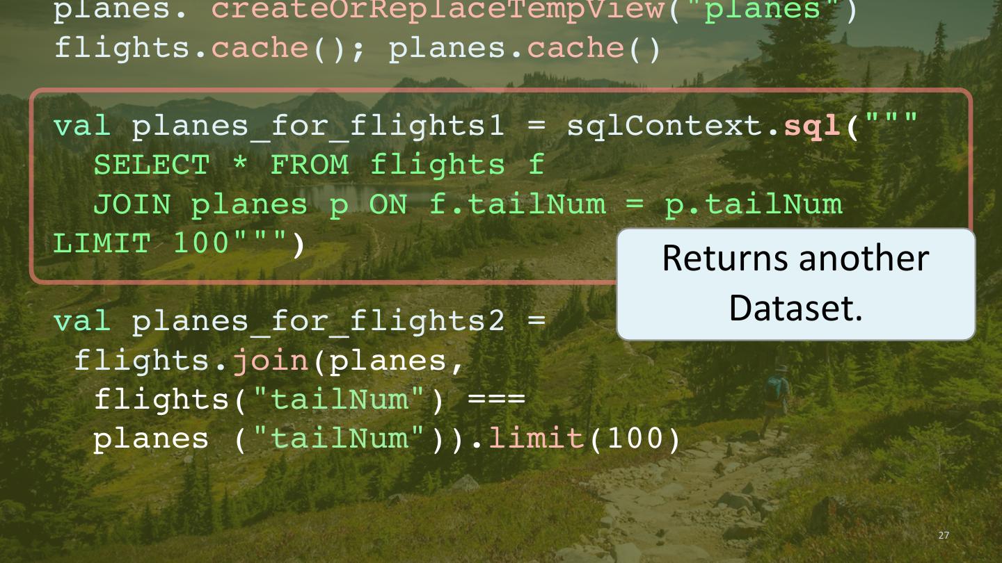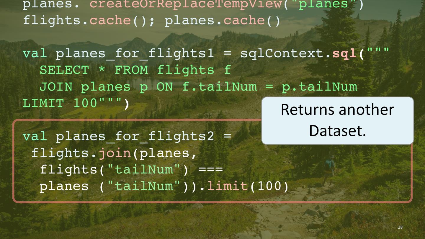 27 .planes. createOrReplaceTempView("planes") flights.cache(); planes.cache() val planes_for_flights1 = sqlContext.sql(""" SELECT * FROM flights f JOIN planes p ON f.tailNum = p.tailNum LIMIT 100""") Returns another val planes_for_flights2 = Dataset. flights.join(planes, flights("tailNum") === planes ("tailNum")).limit(100) 27