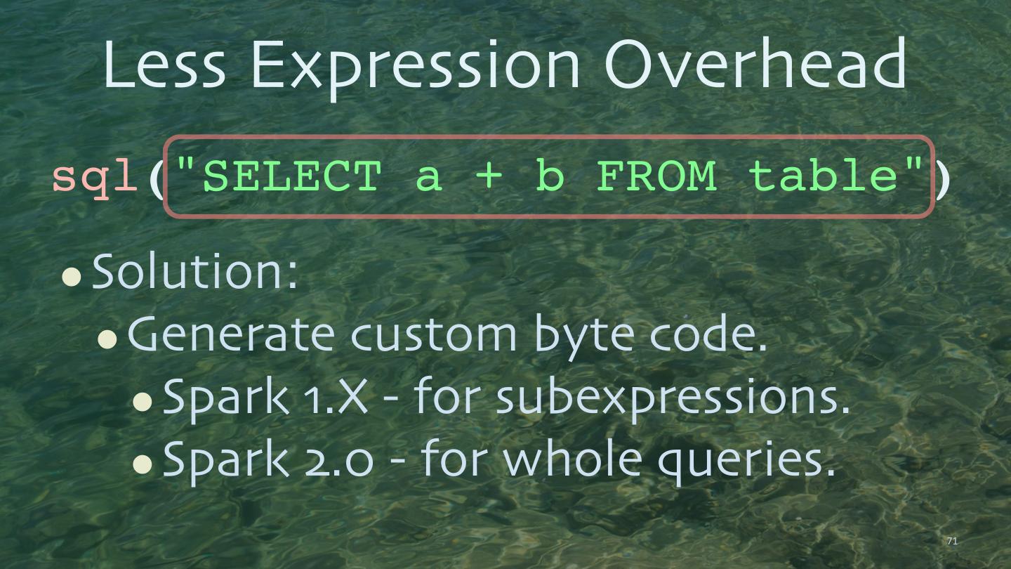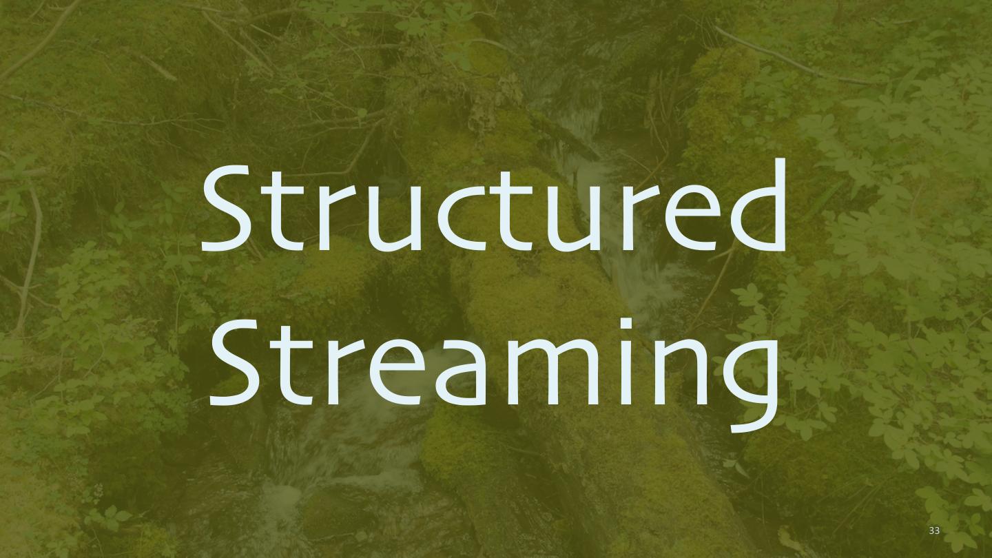 28 .planes. createOrReplaceTempView("planes") flights.cache(); planes.cache() val planes_for_flights1 = sqlContext.sql(""" SELECT * FROM flights f JOIN planes p ON f.tailNum = p.tailNum LIMIT 100""") Returns another val planes_for_flights2 = Dataset. flights.join(planes, flights("tailNum") === planes ("tailNum")).limit(100) 28