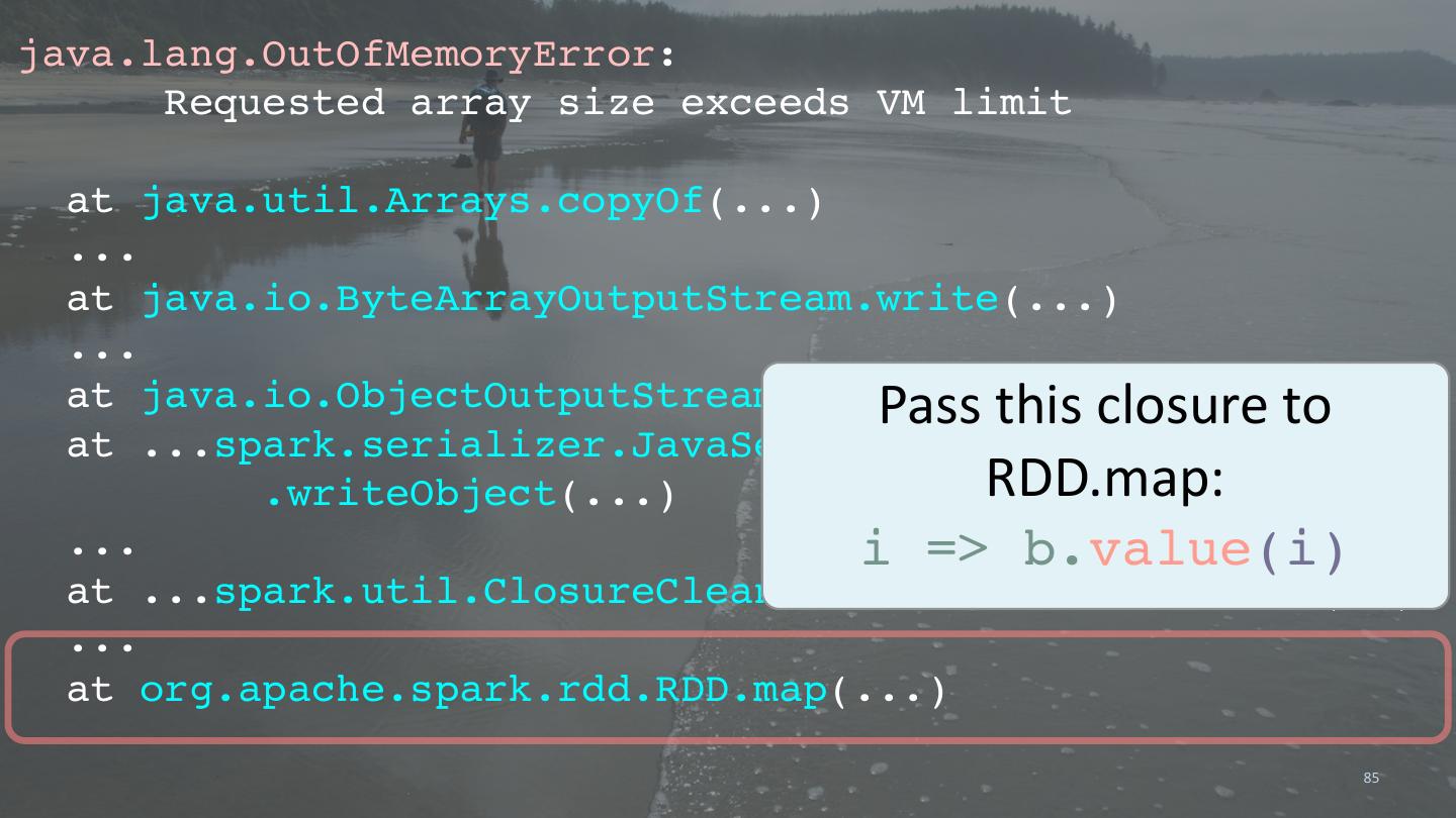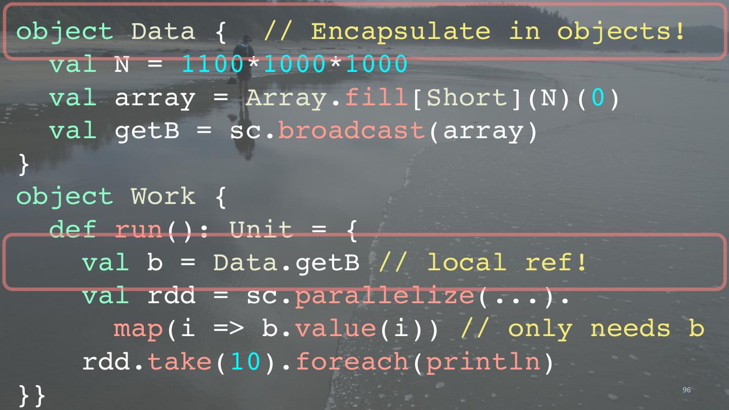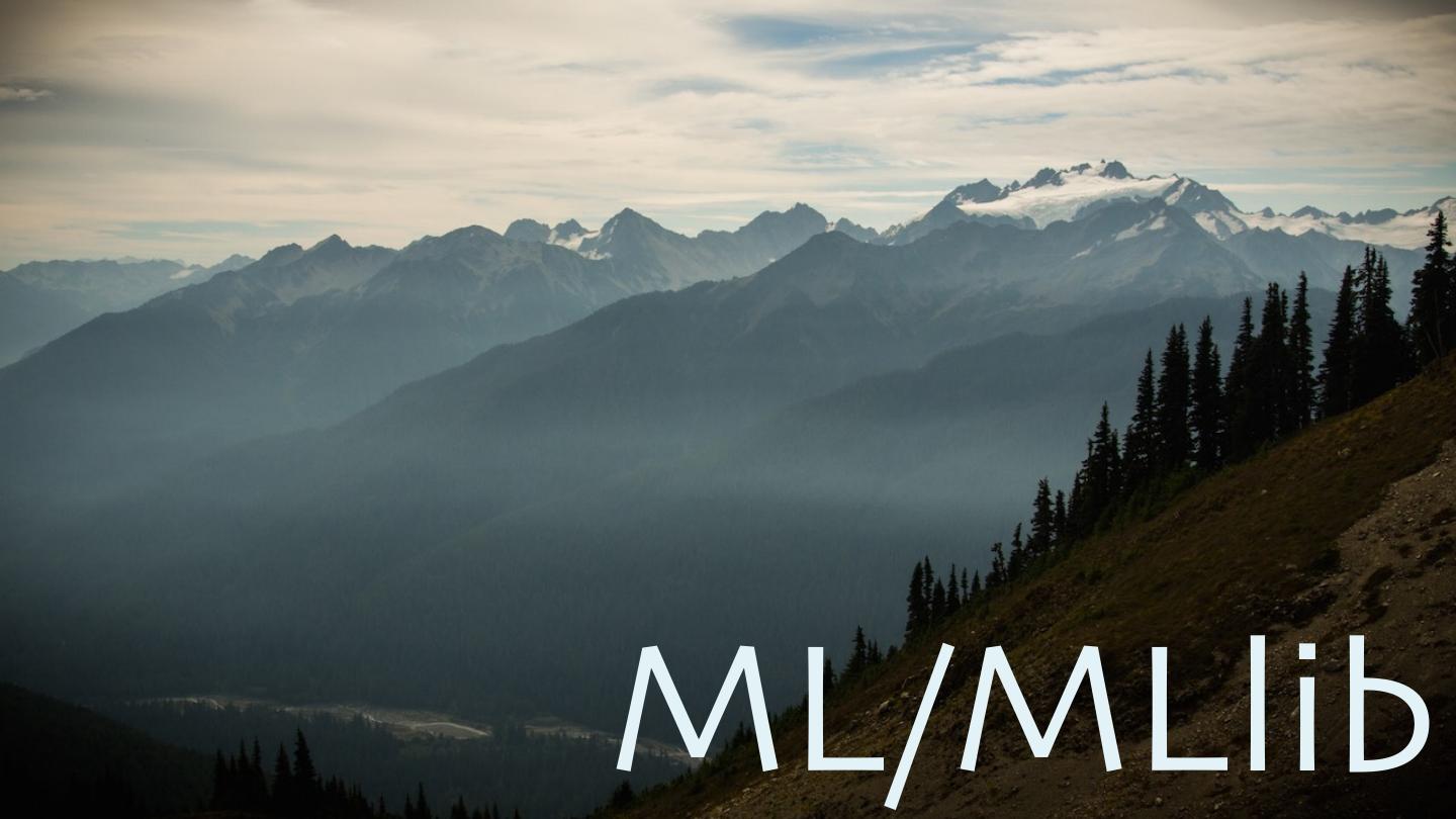 18 . val array = line.split(",", 2) (array(0), array(1)) }.flatMap { case (id, contents) => toWords(contents).map(w => ((w,id),1)) }.reduceByKey(_ + _). map { case ((word,id),n) => (word,(id,n)) RDD[(String,Iterable((String,Int))]: (Hadoop,seq(.../hadoop,20),...)) }.groupByKey. mapValues { seq => sortByCount(seq) }.saveAsTextFile("/path/to/output") 18