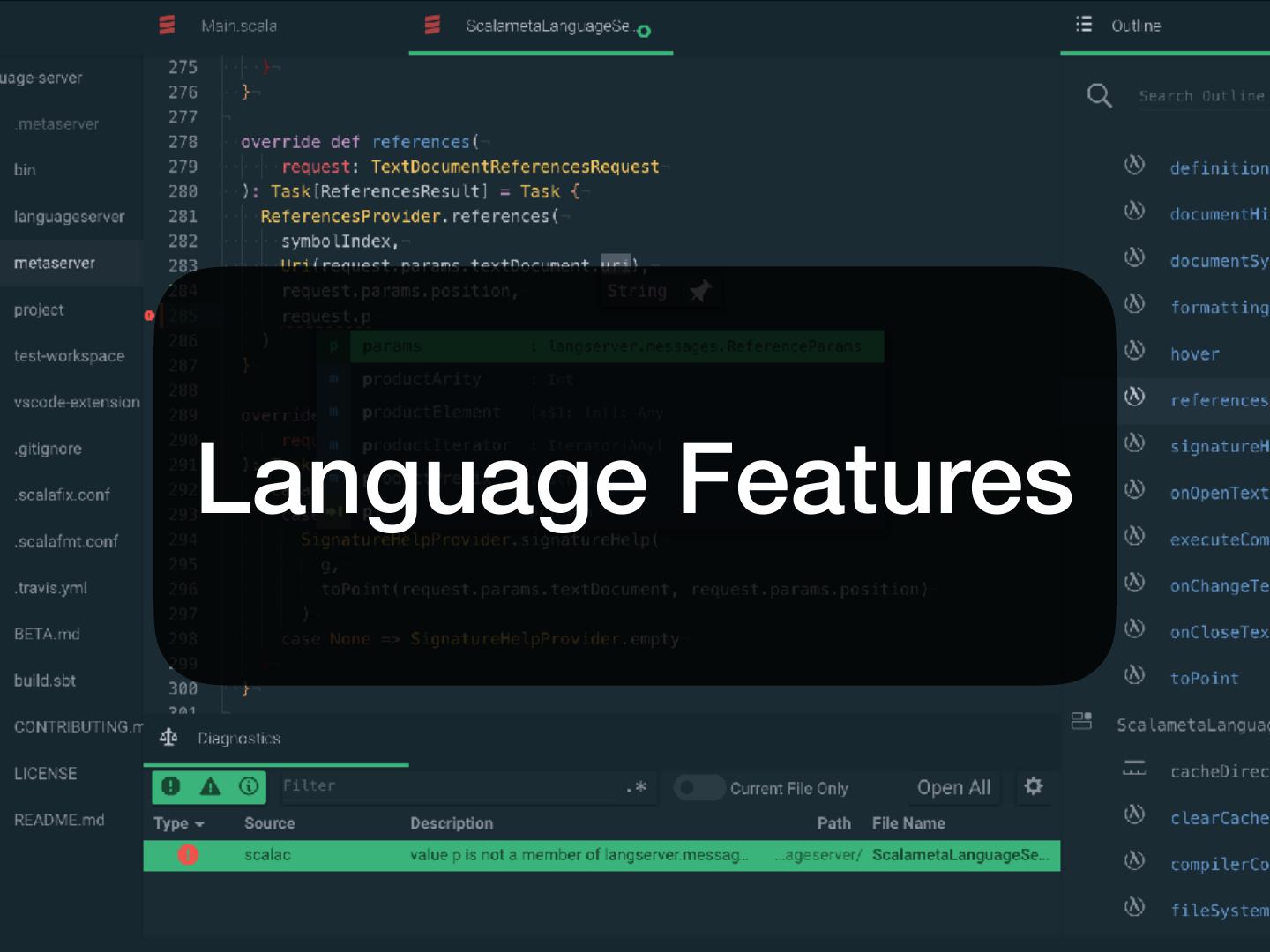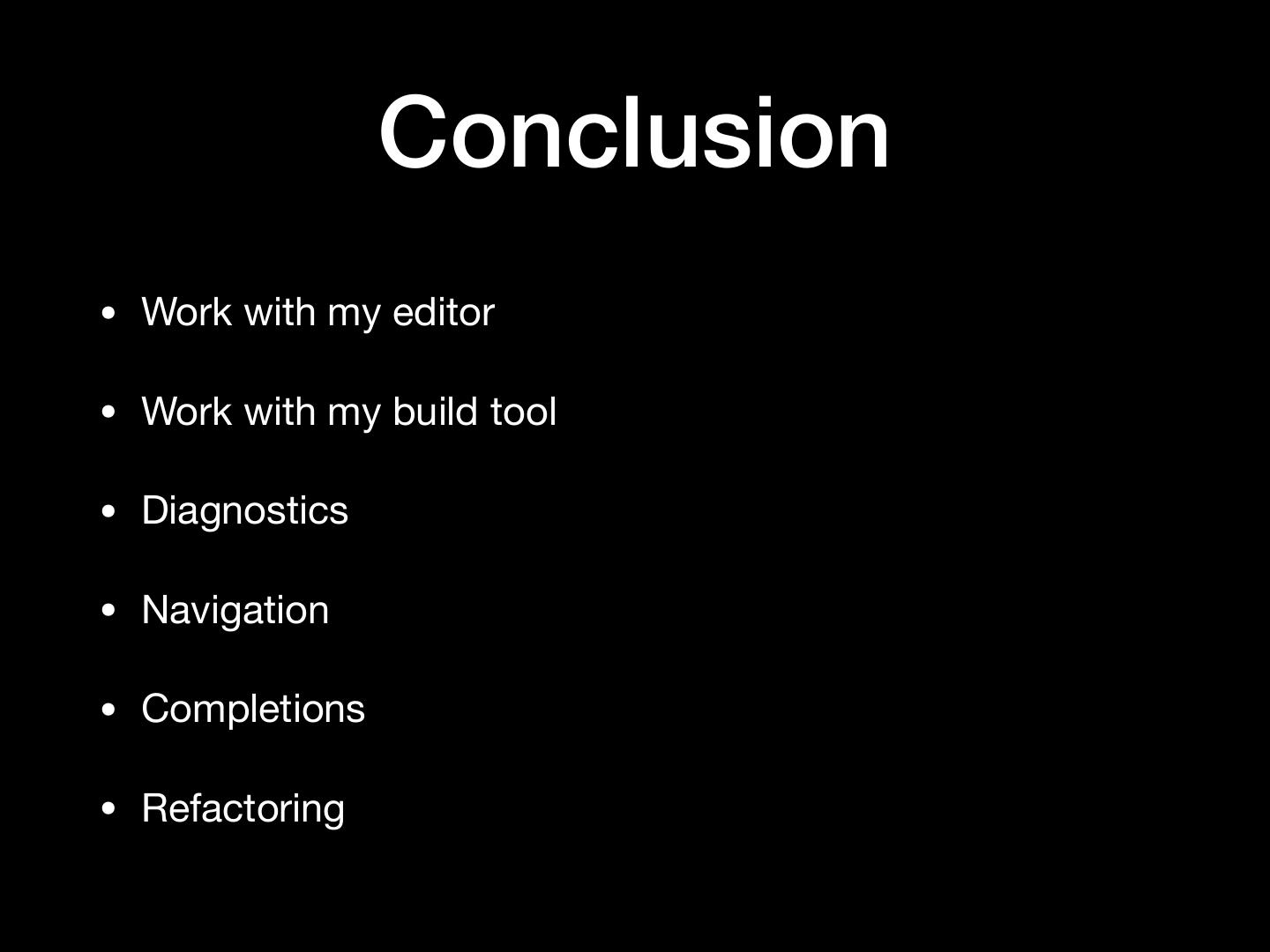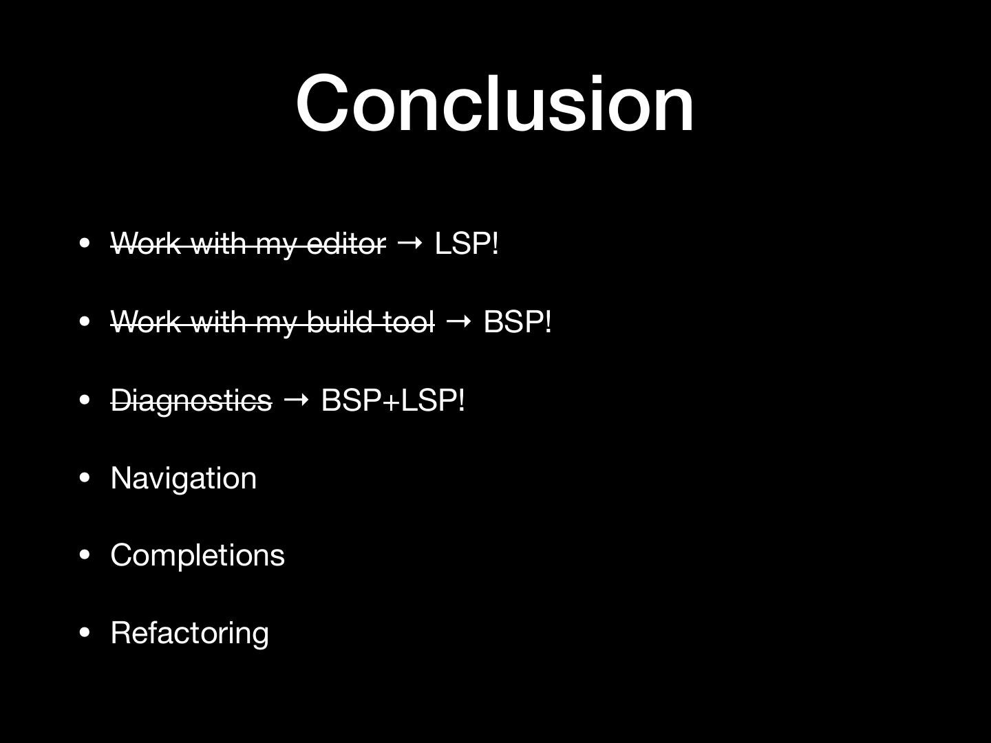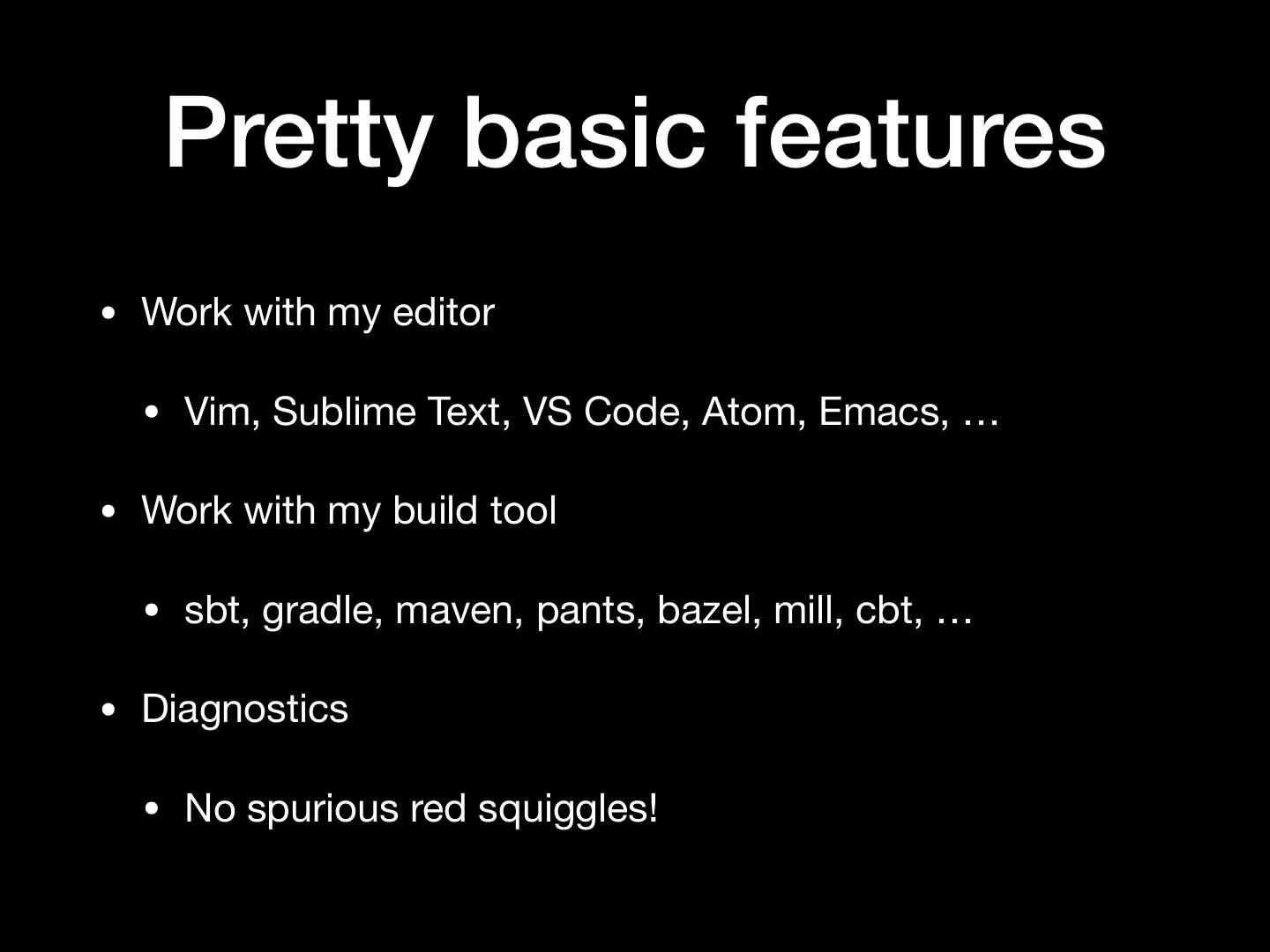 5 . Pretty basic features • Work with my editor • Vim, Sublime Text, VS Code, Atom, Emacs, … • Work with my build tool • sbt, gradle, maven, pants, bazel, mill, cbt, … • Diagnostics • No spurious red squiggles!