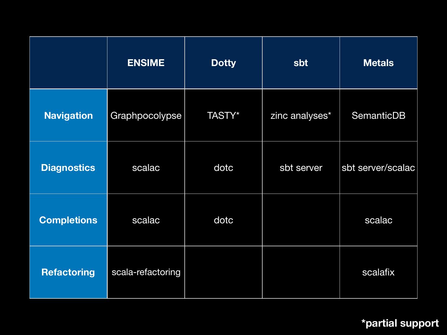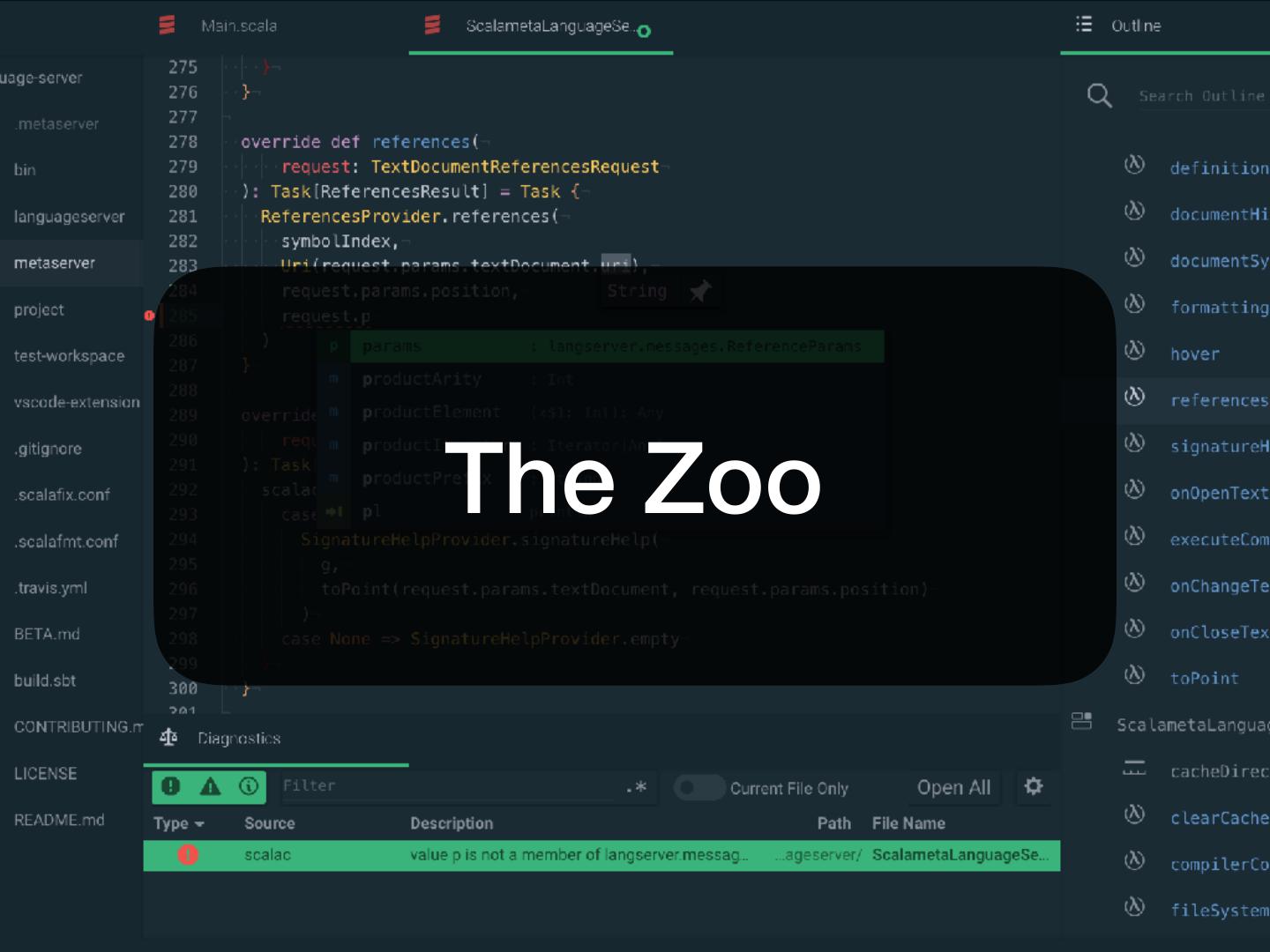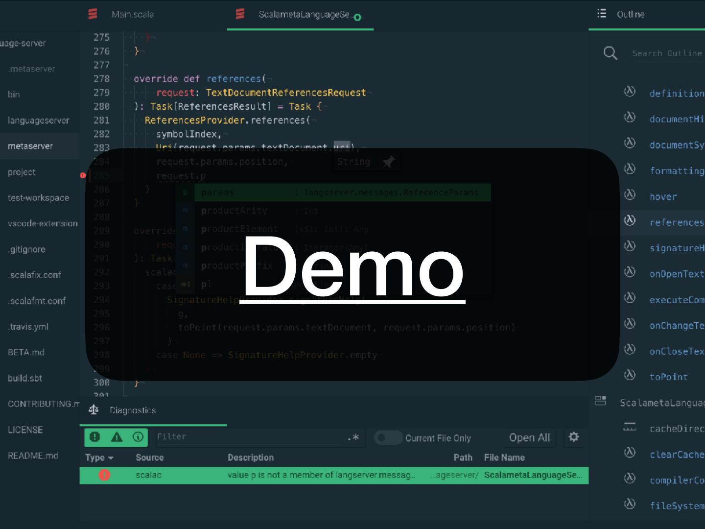 5 . Pretty basic features • Work with my editor • Vim, Sublime Text, VS Code, Atom, Emacs, … • Work with my build tool • sbt, gradle, maven, pants, bazel, mill, cbt, … • Diagnostics • No spurious red squiggles!