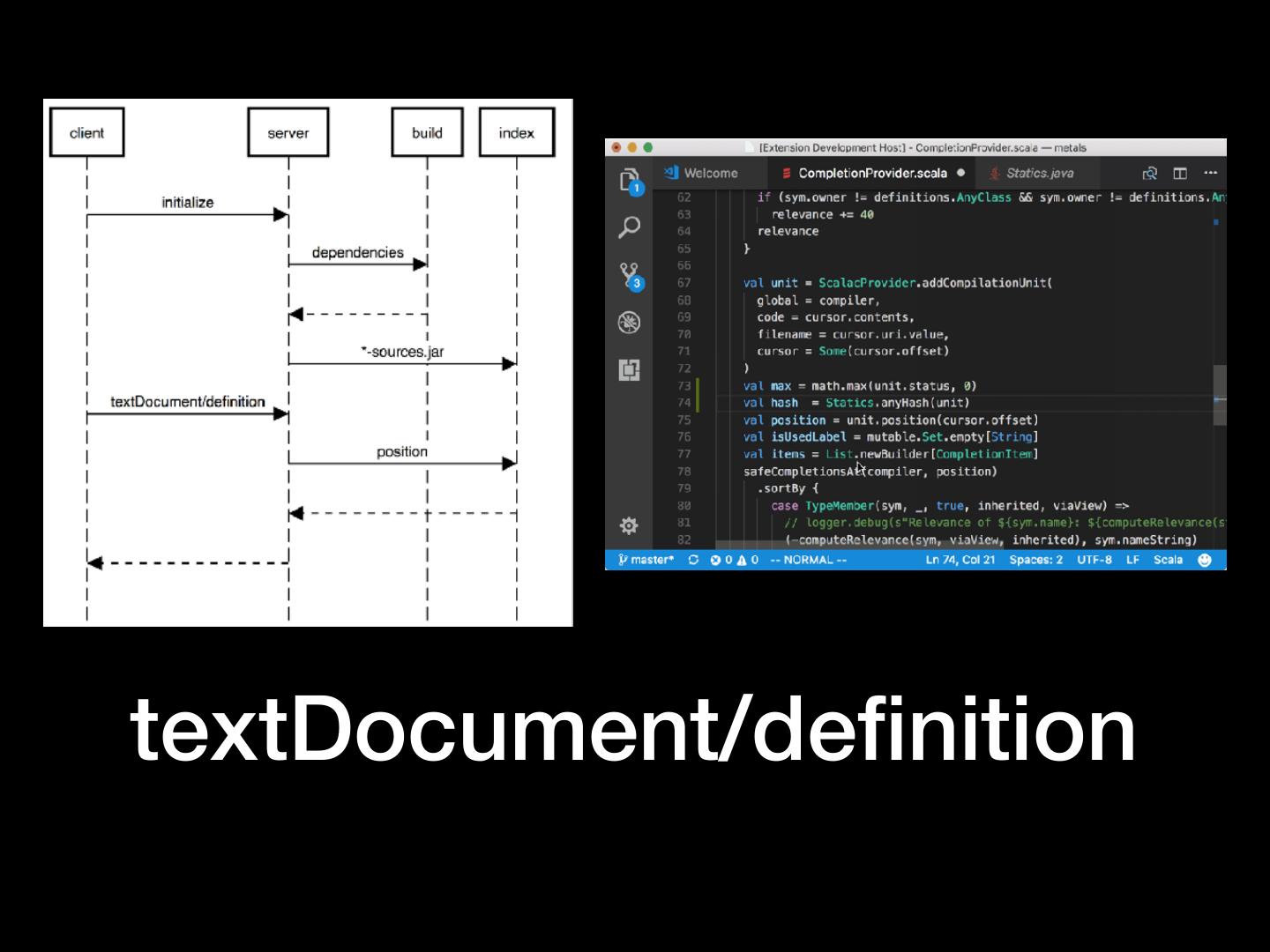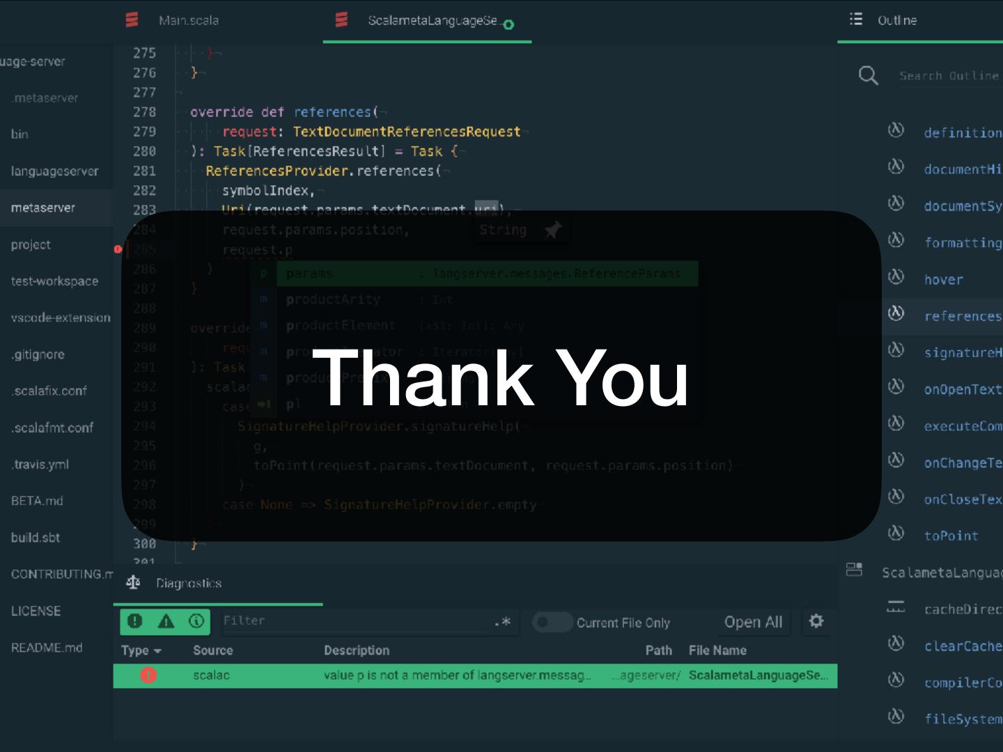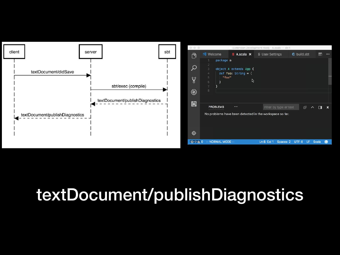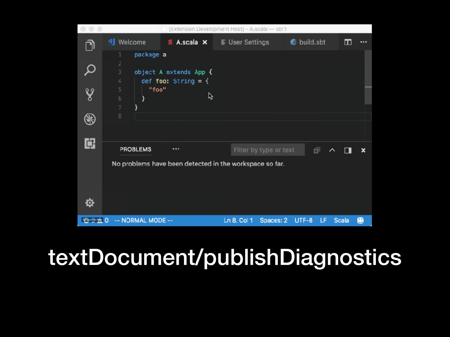 5 . Pretty basic features • Work with my editor • Vim, Sublime Text, VS Code, Atom, Emacs, … • Work with my build tool • sbt, gradle, maven, pants, bazel, mill, cbt, … • Diagnostics • No spurious red squiggles!