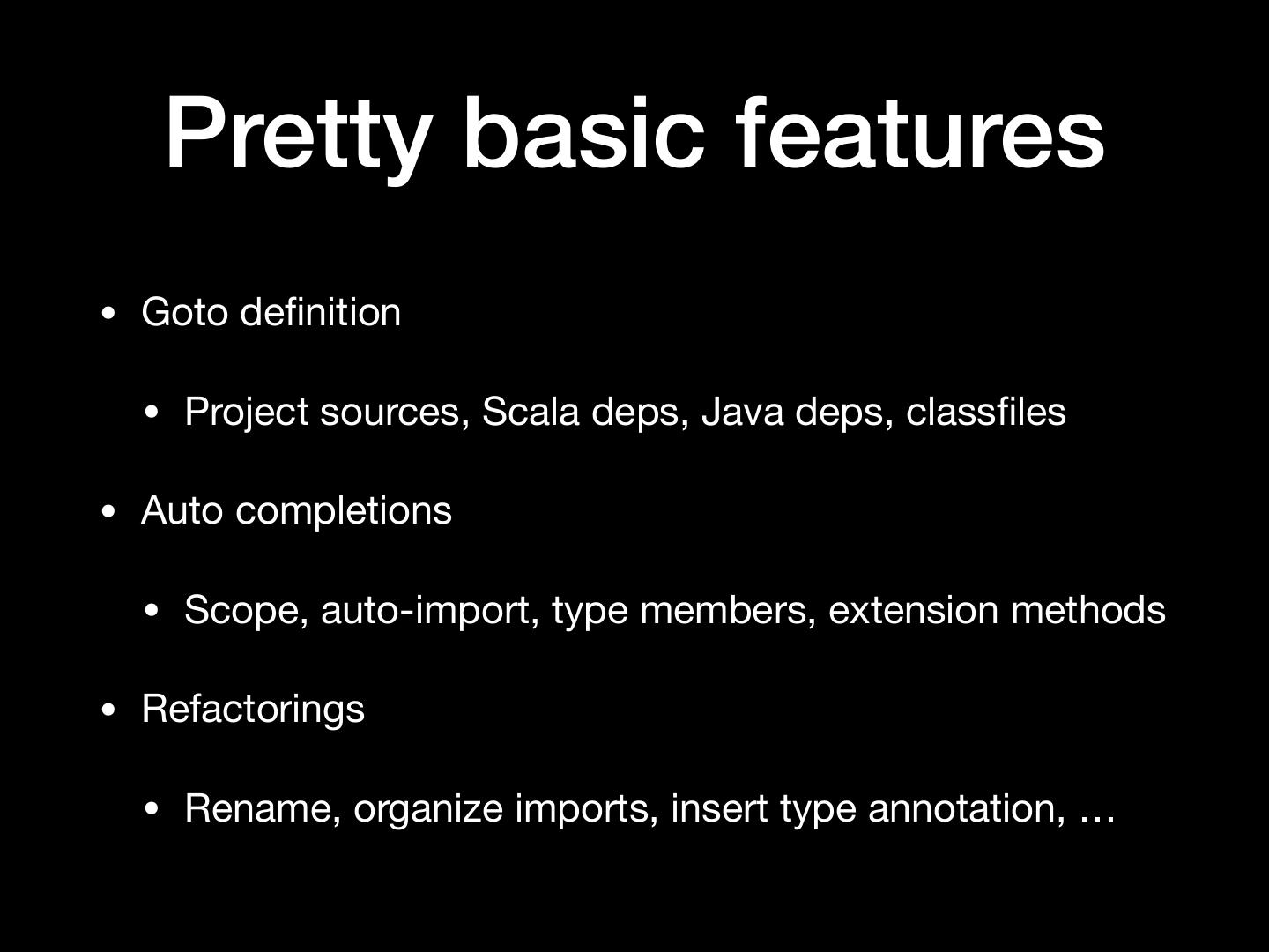 6 . Pretty basic features • Goto definition • Project sources, Scala deps, Java deps, classfiles • Auto completions • Scope, auto-import, type members, extension methods • Refactorings • Rename, organize imports, insert type annotation, …